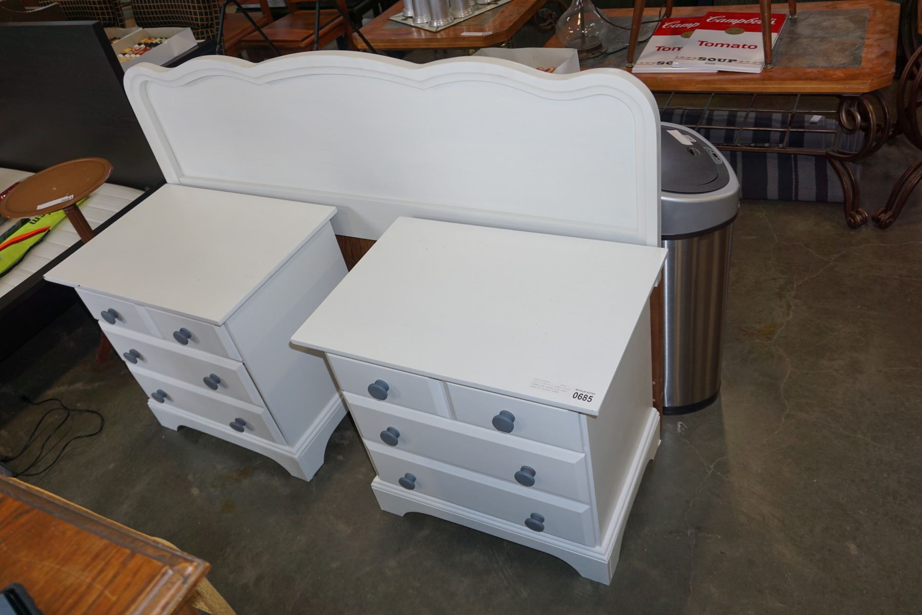 PAIR OF WHITE 2 DRAWER NIGHT STANDS AND QUEEN SIZE HEAD BOARD W/ ROLLER FRAME