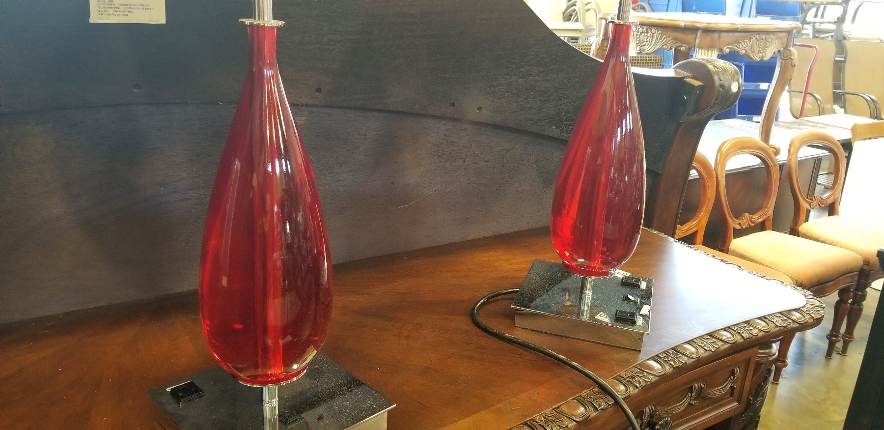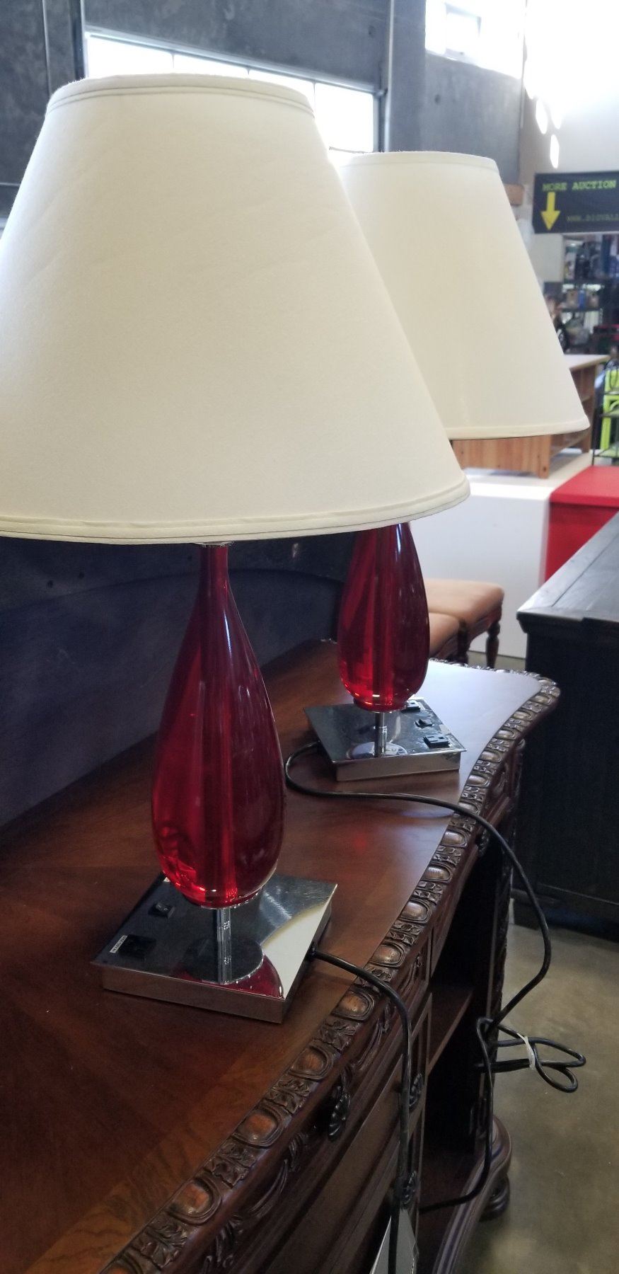 PAIR RED GLASS AND CHROME TABLE LAMP WITH OUTLETS