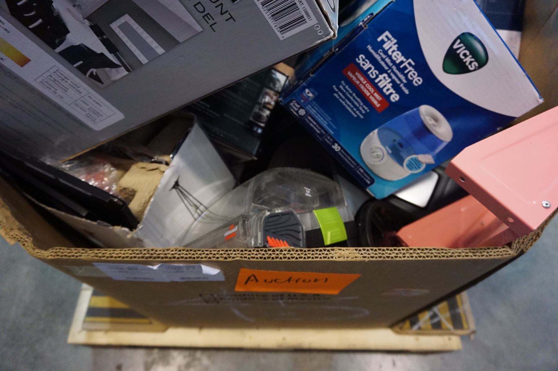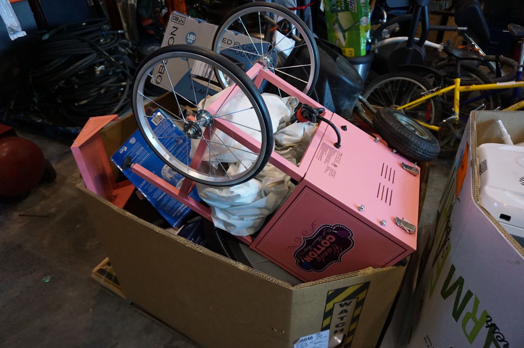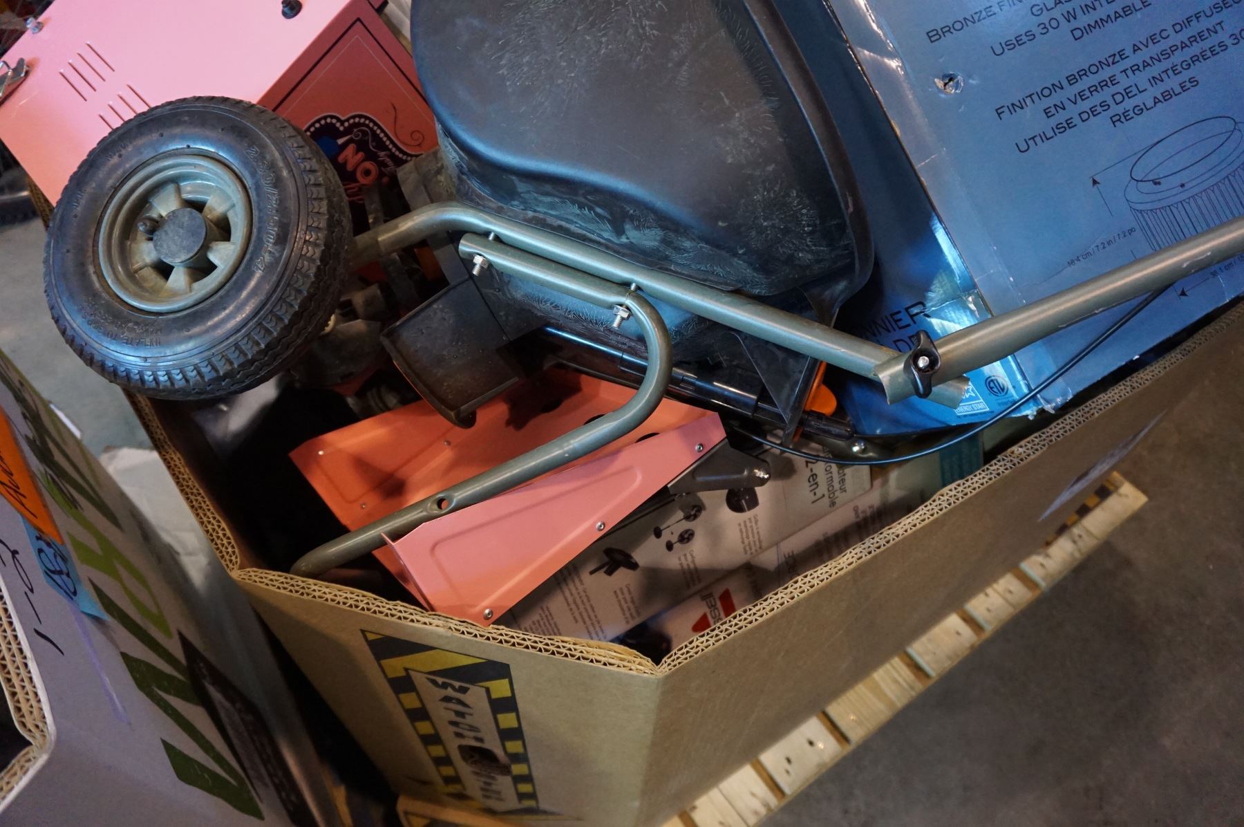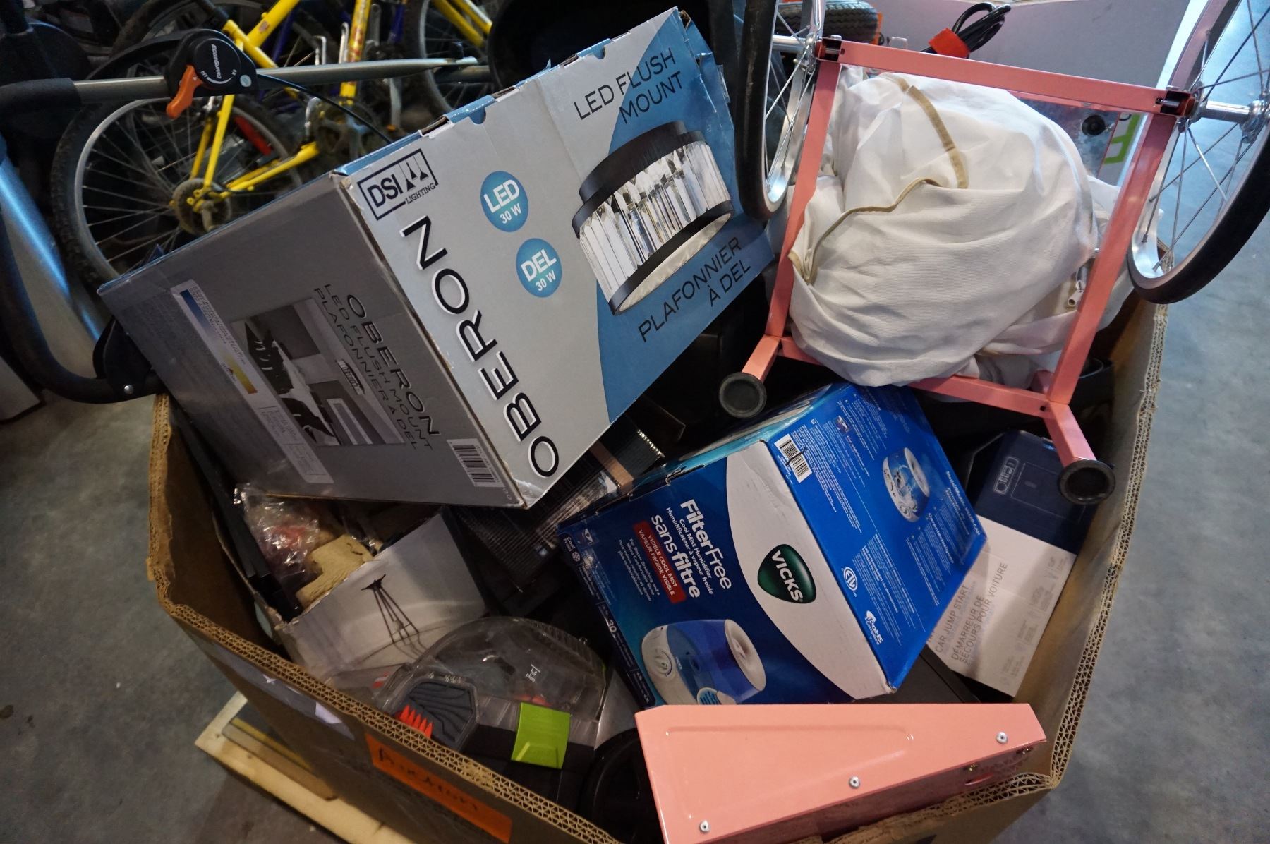 PALLET OF RETURNED POPCORN MAKER, LIGHT FIXTURE, GRASS SEEDER, ETC