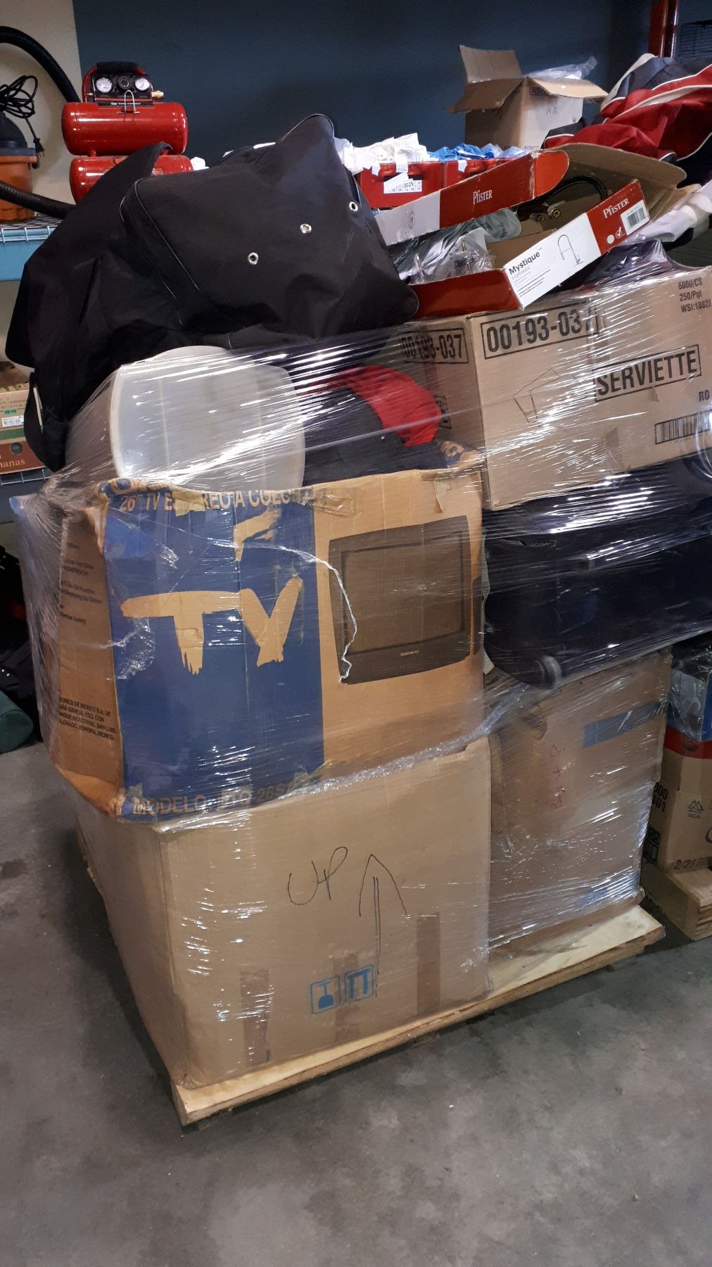 PALLET OF UNSORTED STORAGE LOCKER ITEMS, TOOLS, ELECTRONICS, ETC