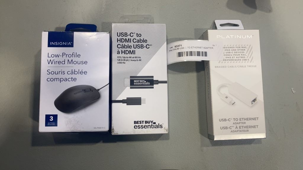 PALTINUM USB C TO ETHERNET ADAPTER, USB C TO HDMI CABLE AND INSIGNIA LOW PROFILE WIRED MOUSE