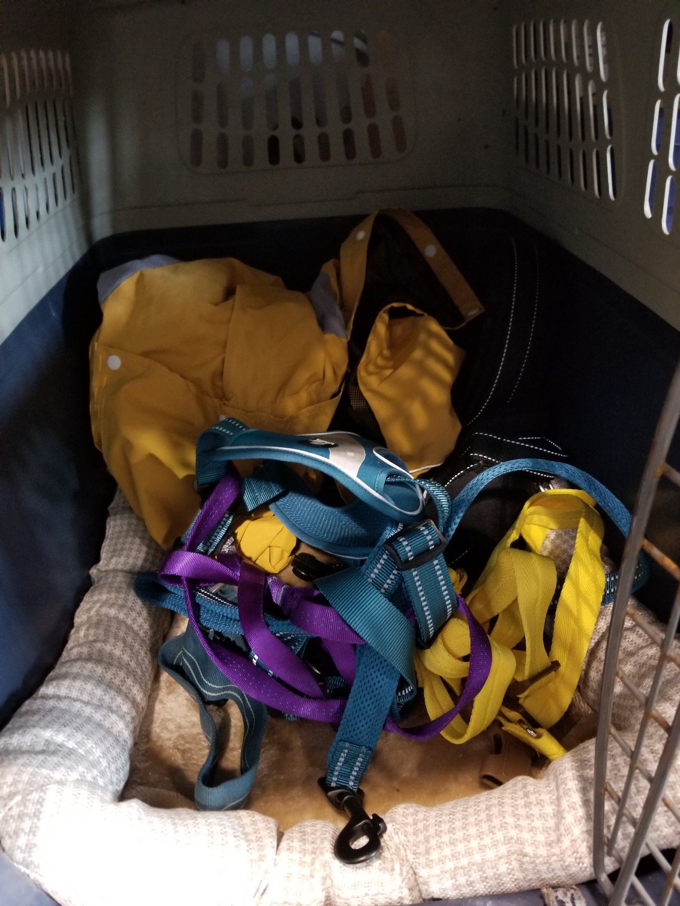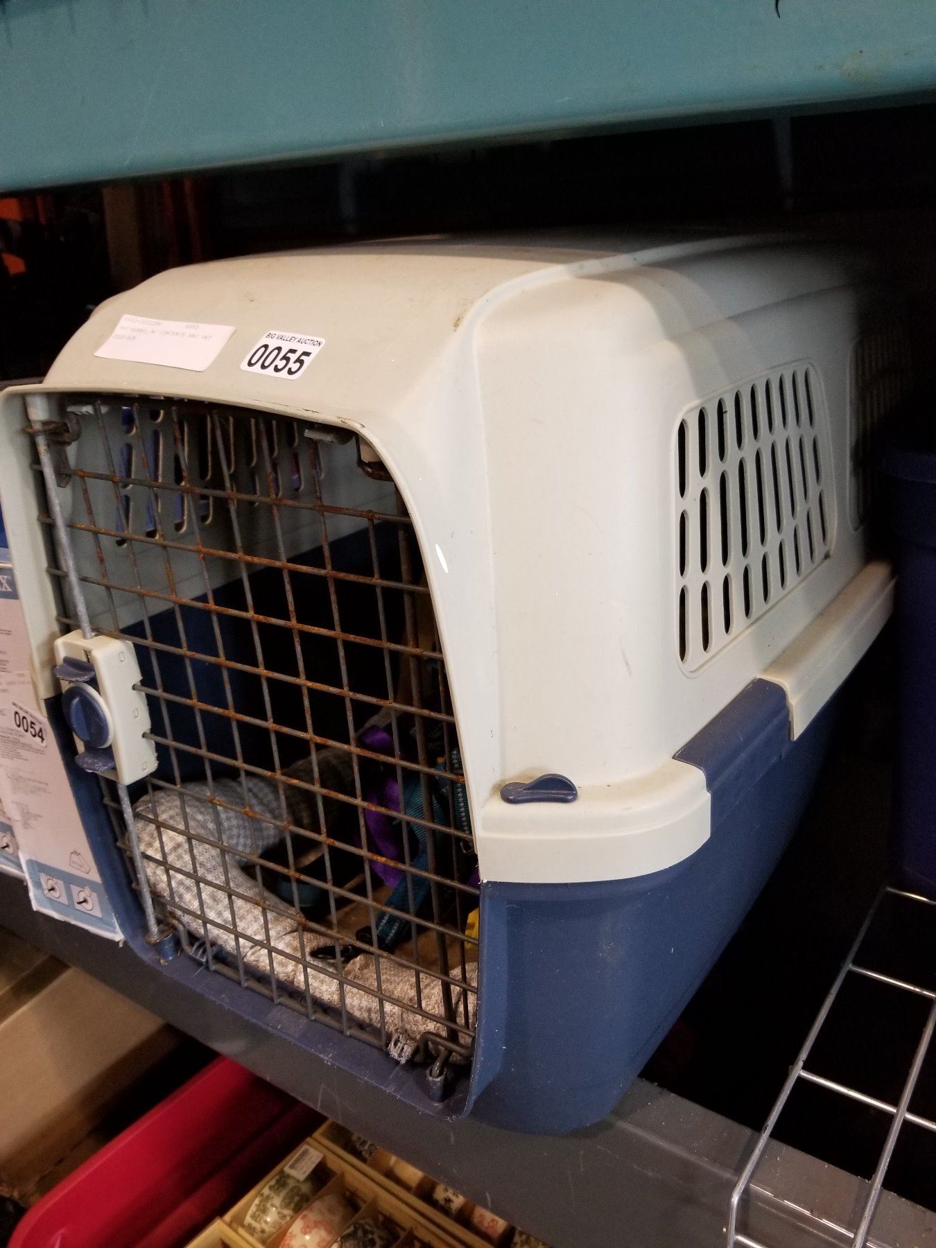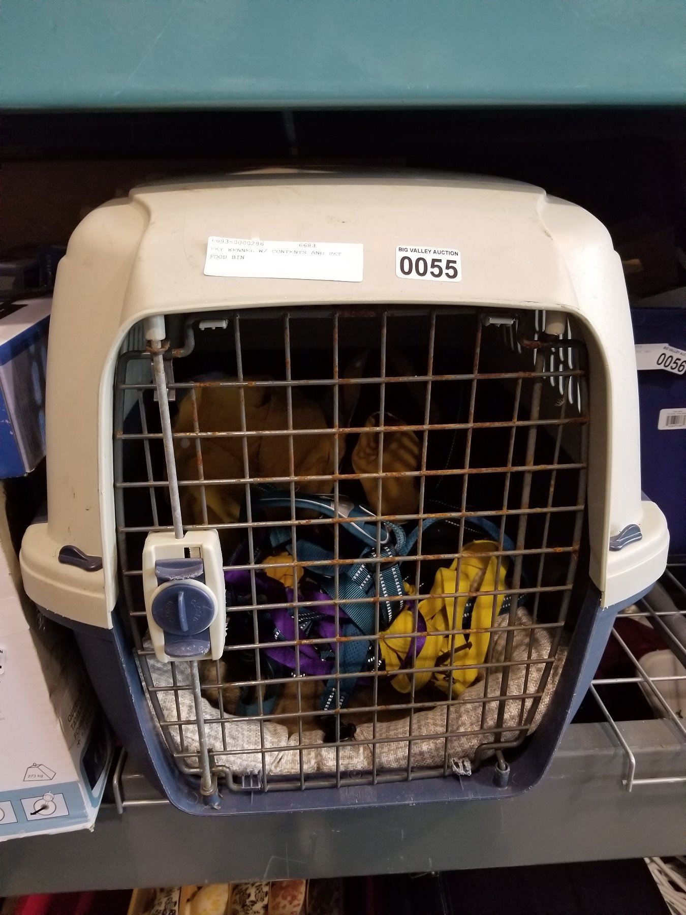 PET KENNEL W/ CONTENTS AND PET FOOD BIN