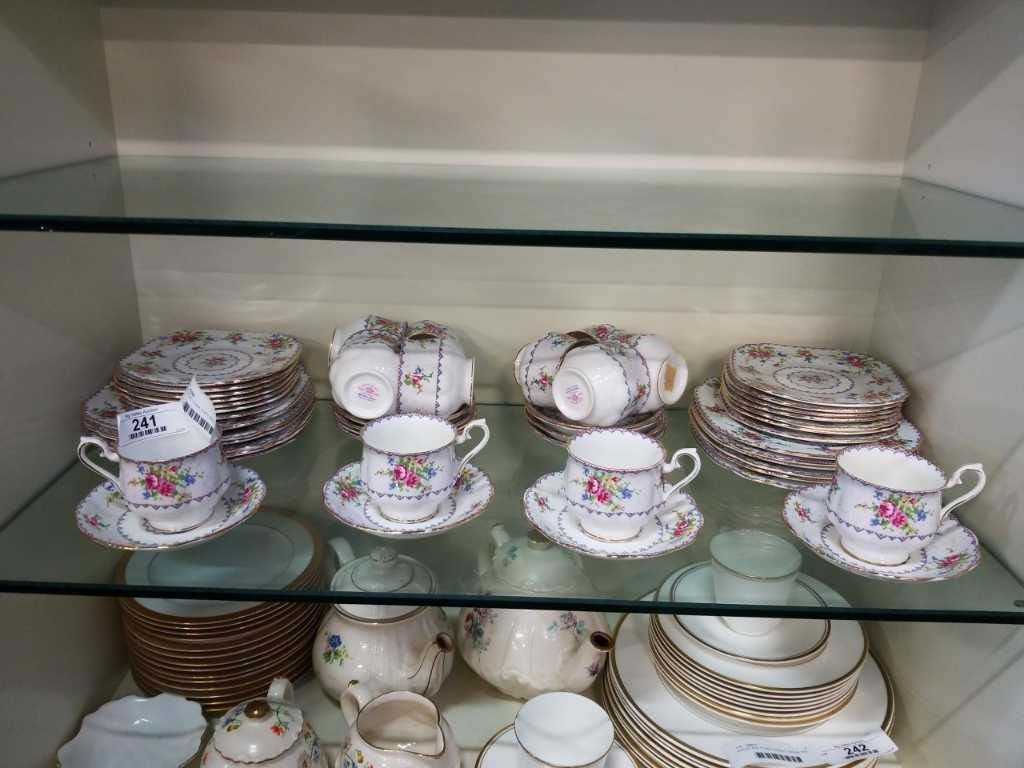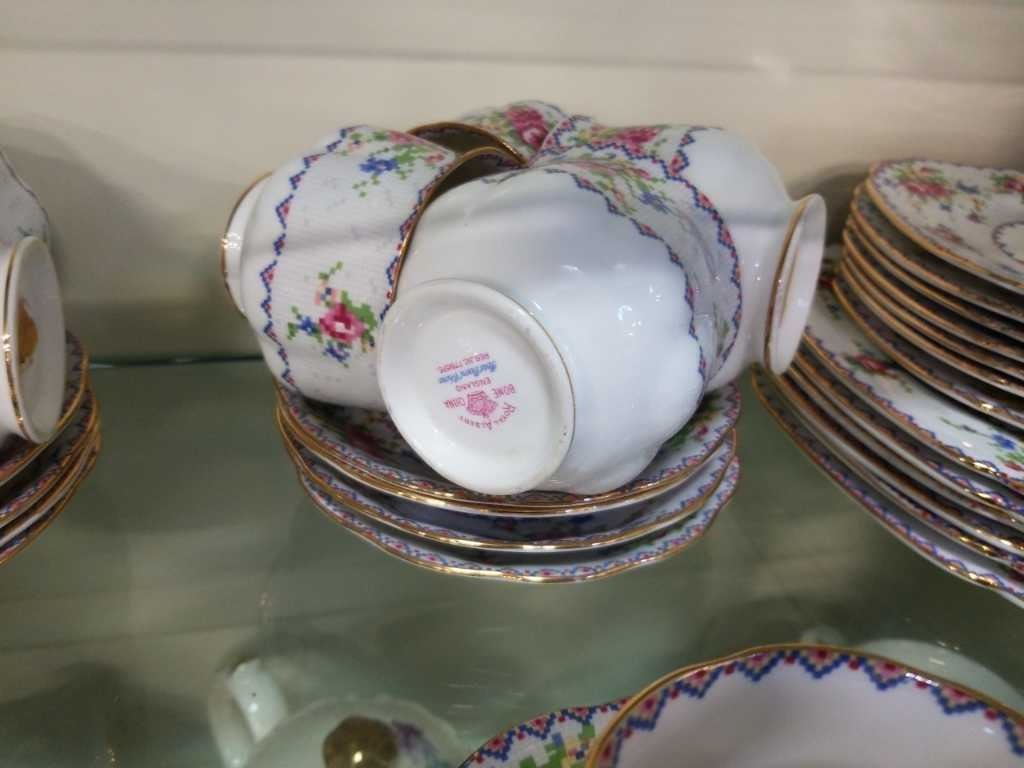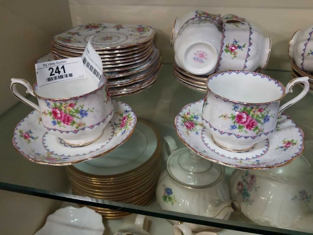 PETIT POINT CHINA CUPS AND SAUCERS AND PLATES
