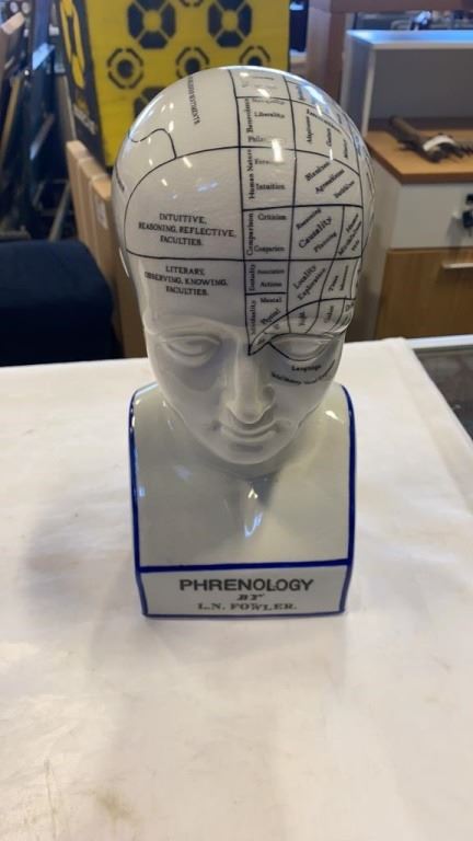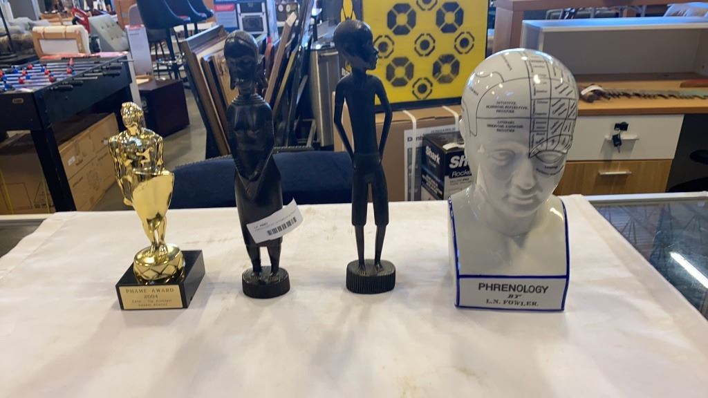 PHRENOLOGY BY LN FOWLER AUTHENTIC MODEL, BRASS TROPHY AND 2 WOOD FIGURES
