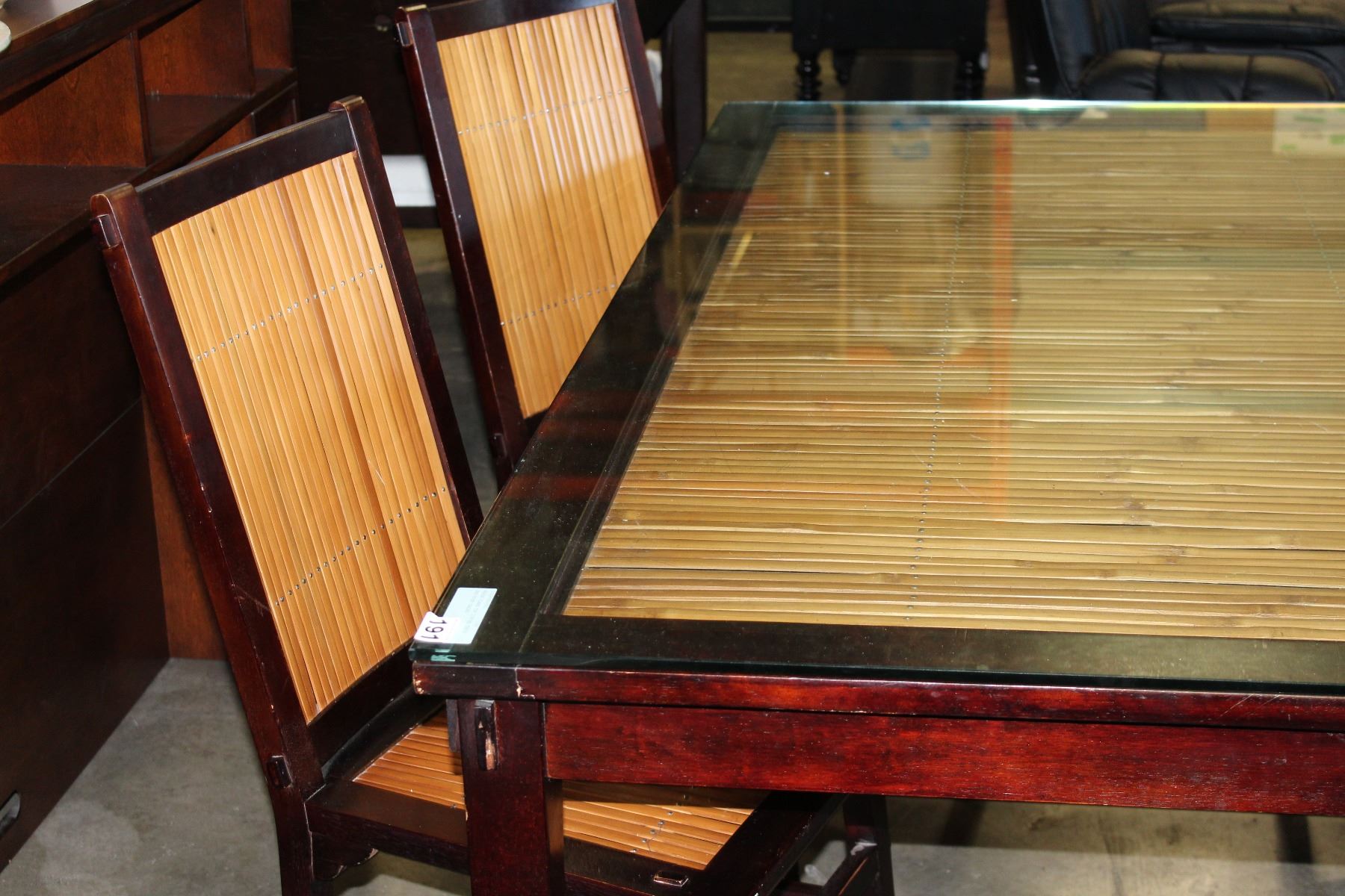 PIER 1 IMPORTS MODERN GLASS TOP RATTAN DINING TABLE AND FOUR CHAIRS