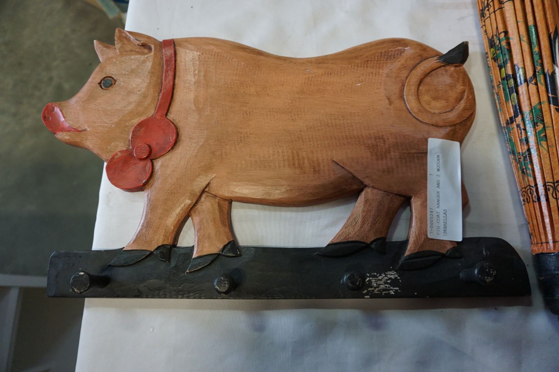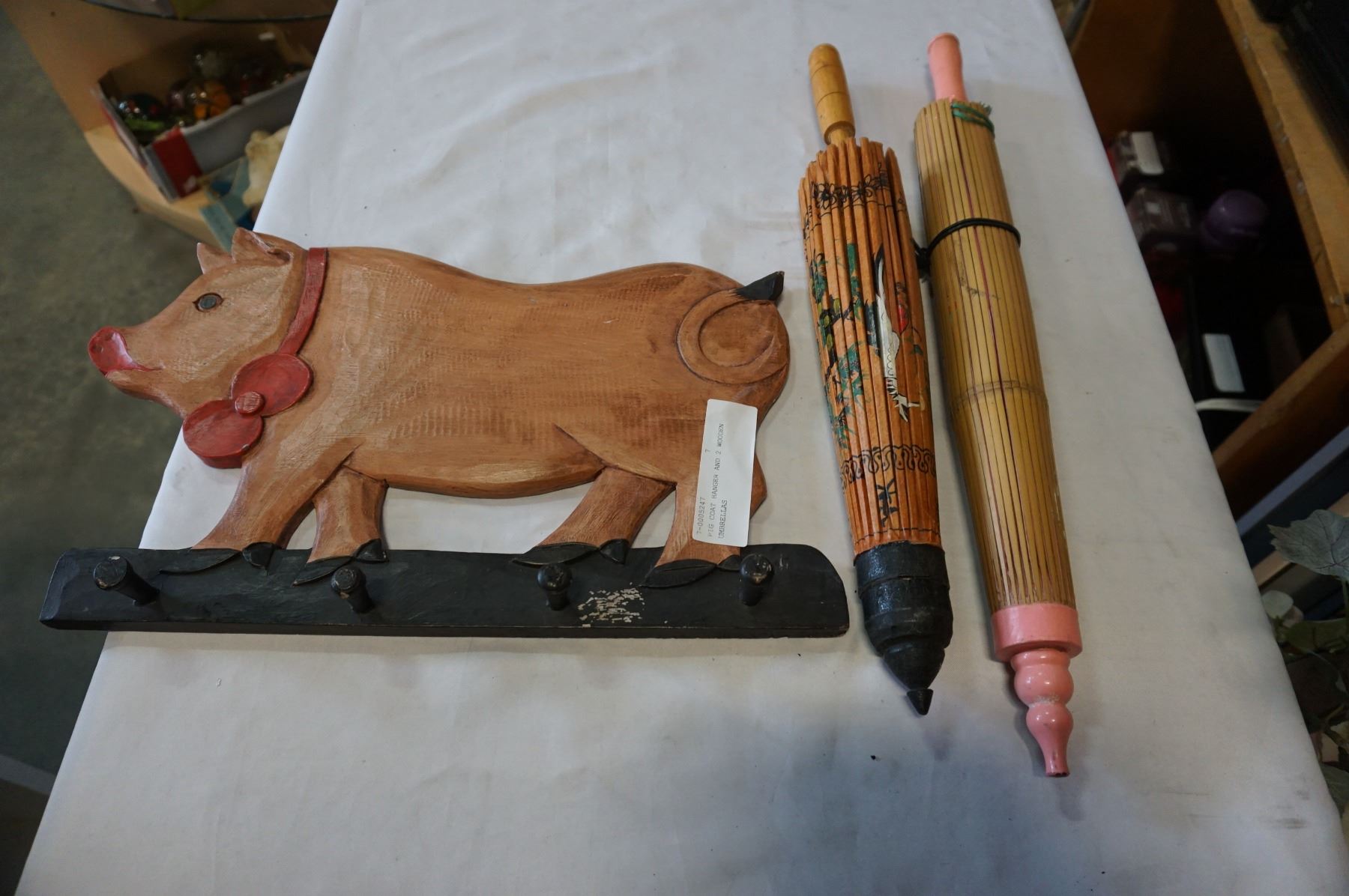 PIG COAT HANGER AND 2 WOODEN UMBRELLAS