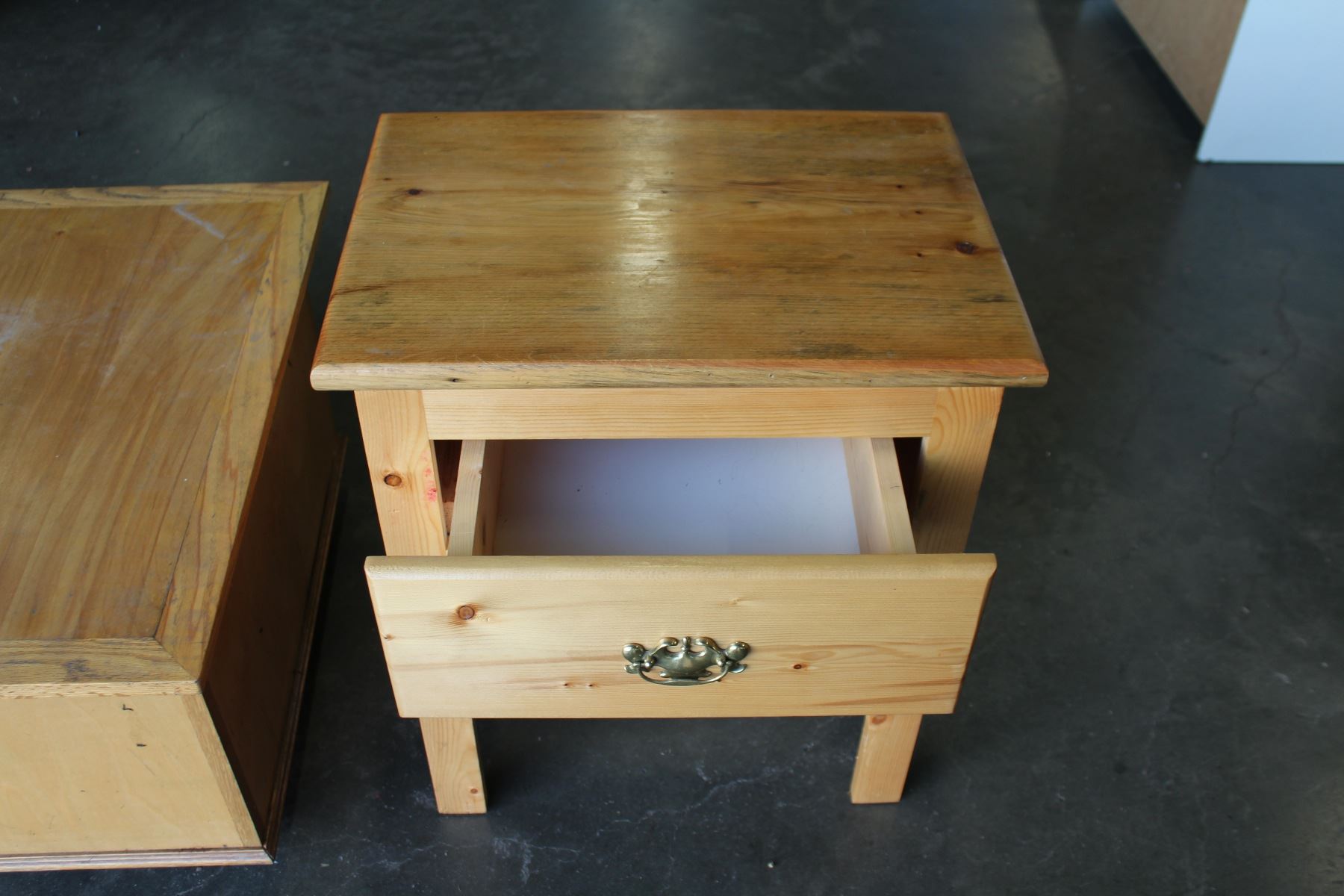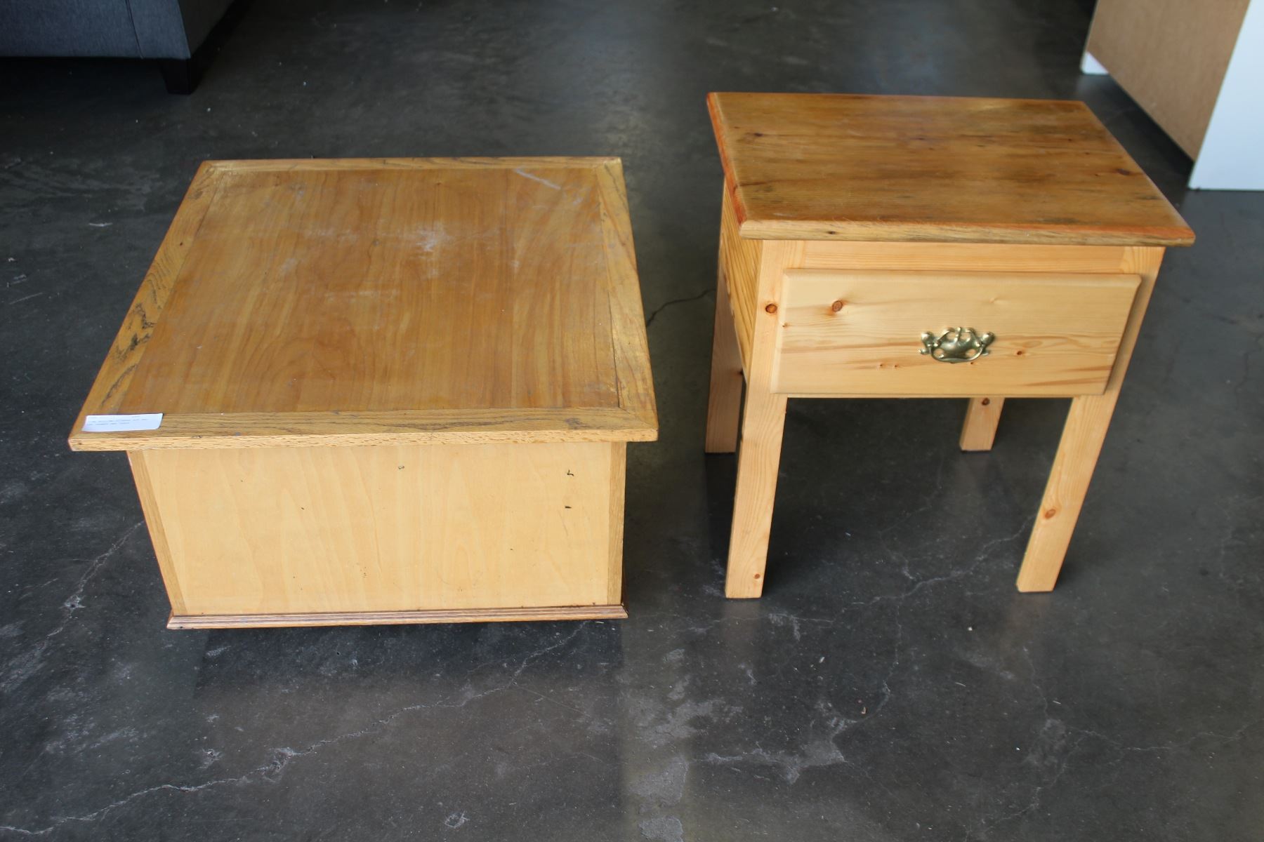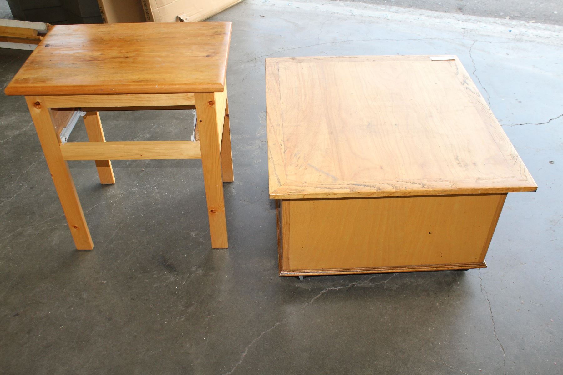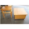 PINE ROLLING STORAGE BOX AND ONE DRAWER END TABLE