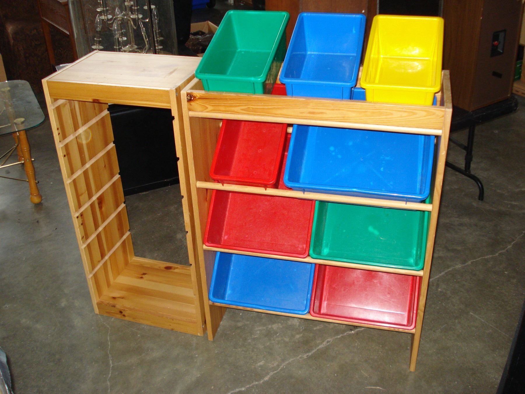 PINE SHELF WITH PLASTIC BINS AND PINE SHELF