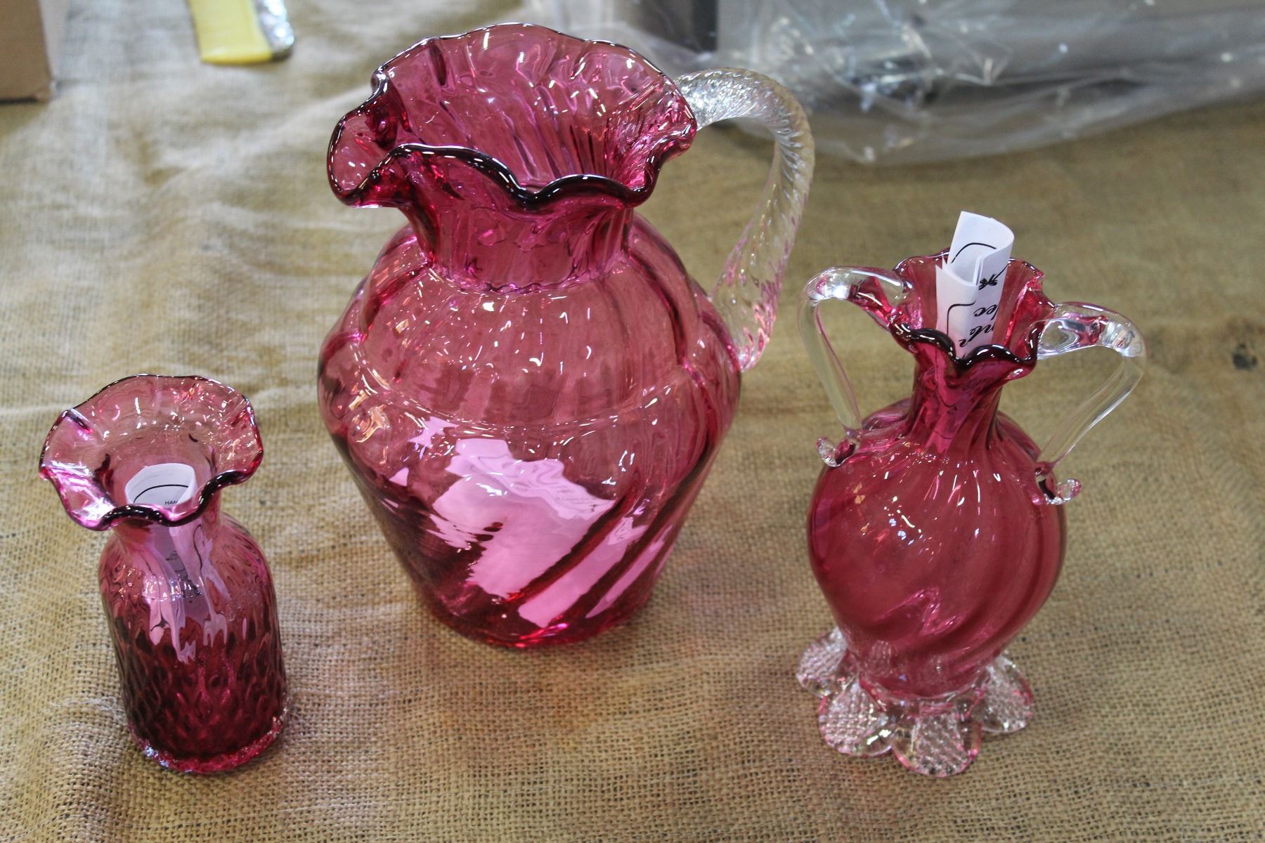 PINK GLASS HERITAGE PITCHER AND TWO VASES