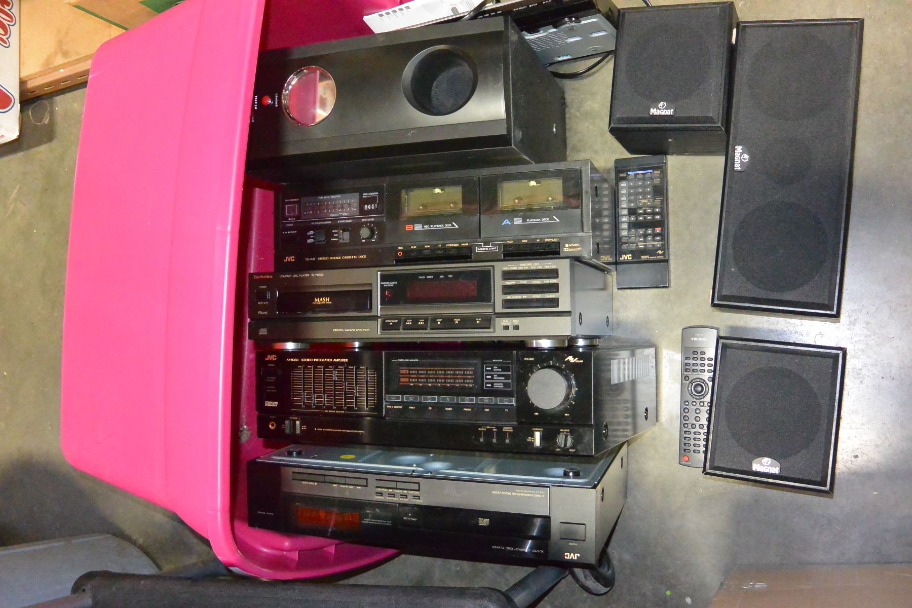 PINK TOTE OF JVC AND TECHNICS STEREO COMPONENTS AND SPEAKERS AND TOSHIBA DVD PLAYER