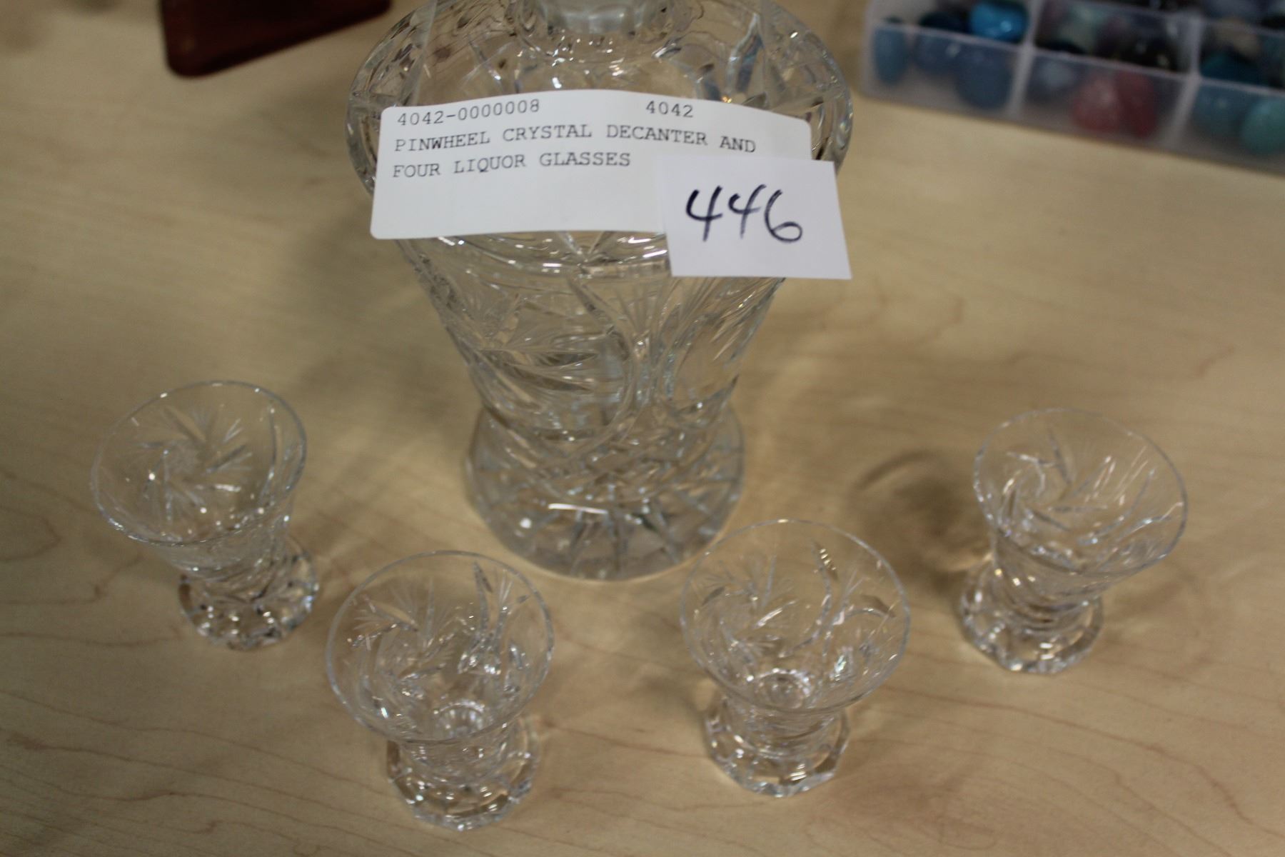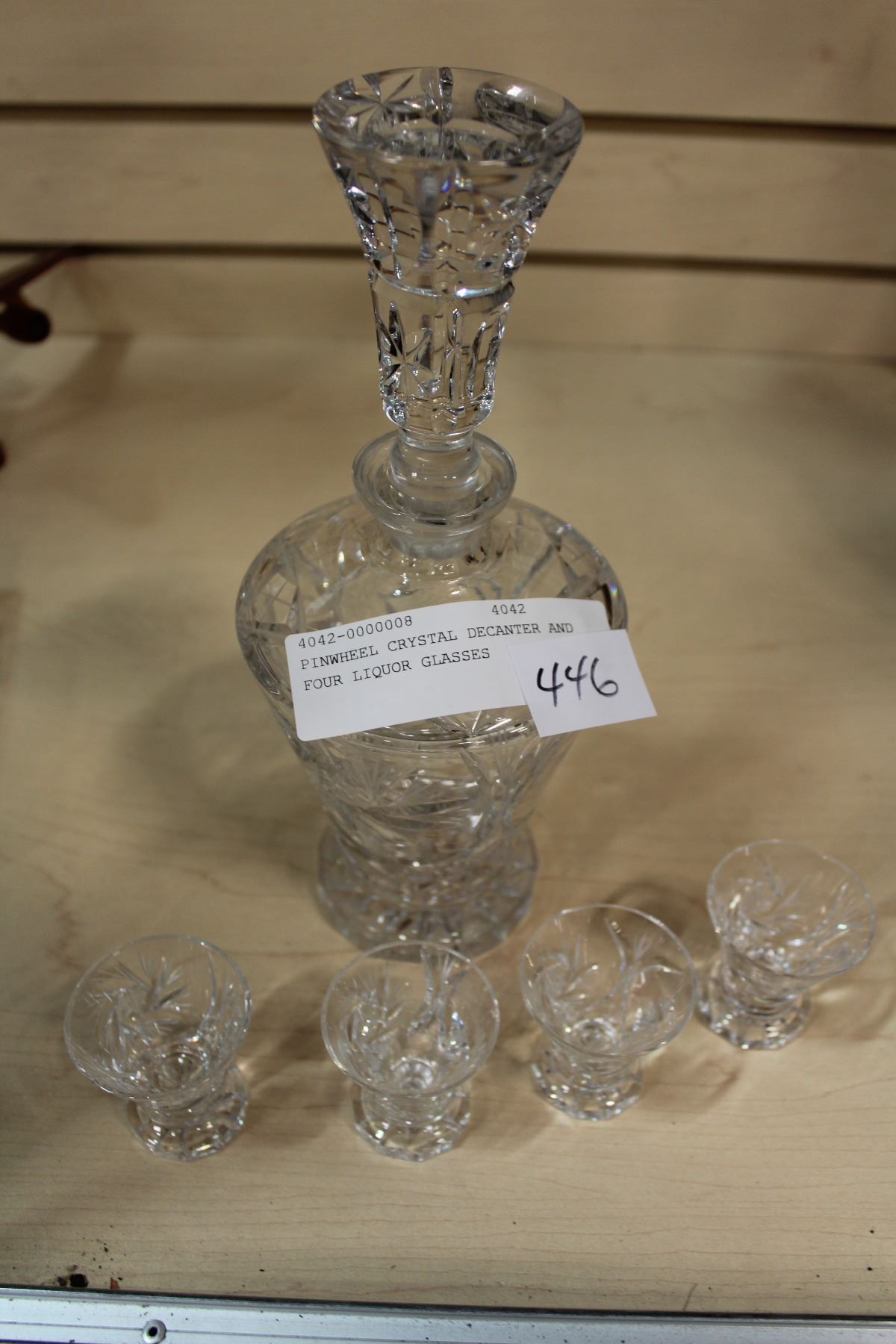 PINWHEEL CRYSTAL DECANTER AND FOUR LIQUOR GLASSES