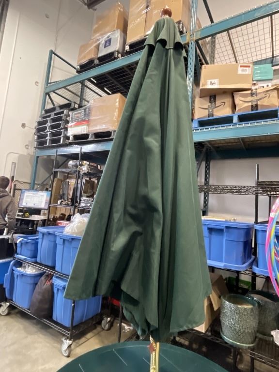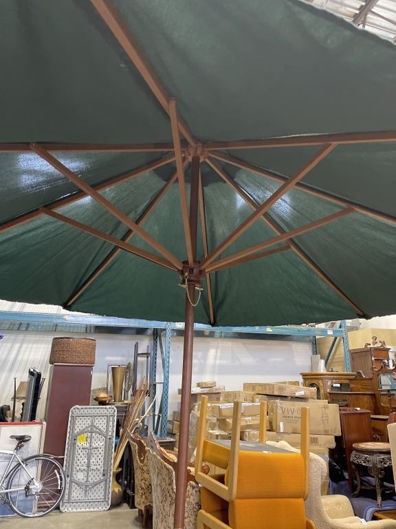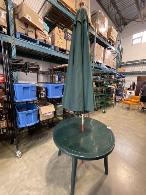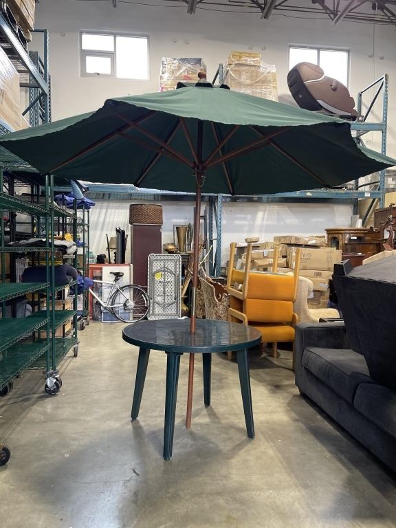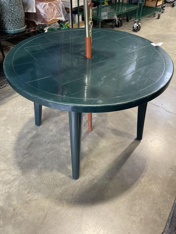 PLASTIC ROUND PATIO TABLE AND WOODEN TEAK FRAMED UMBRELLA