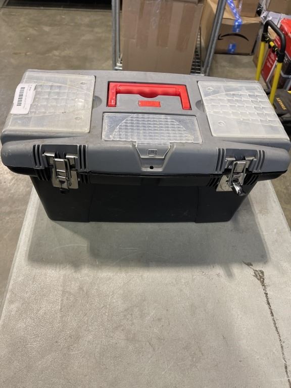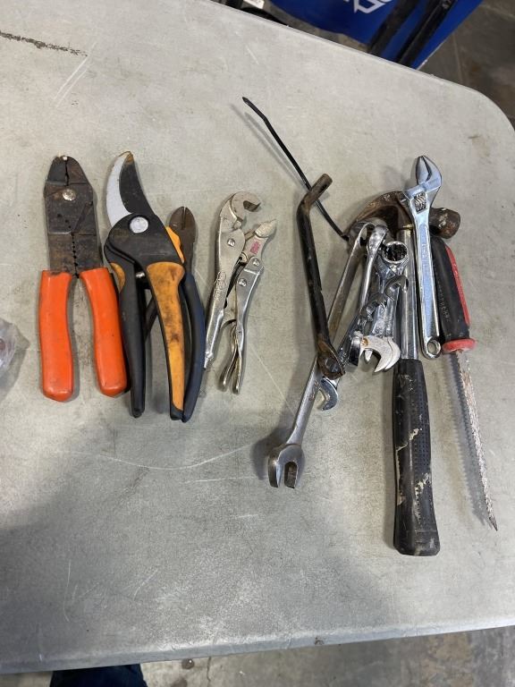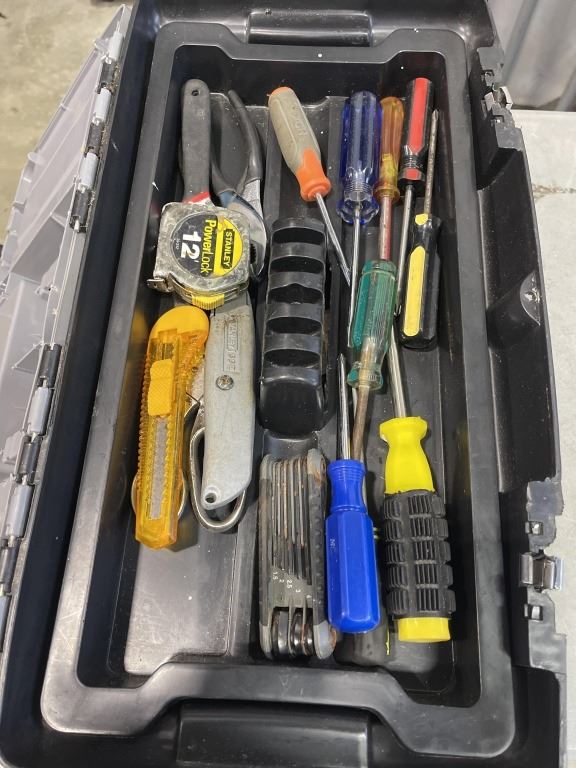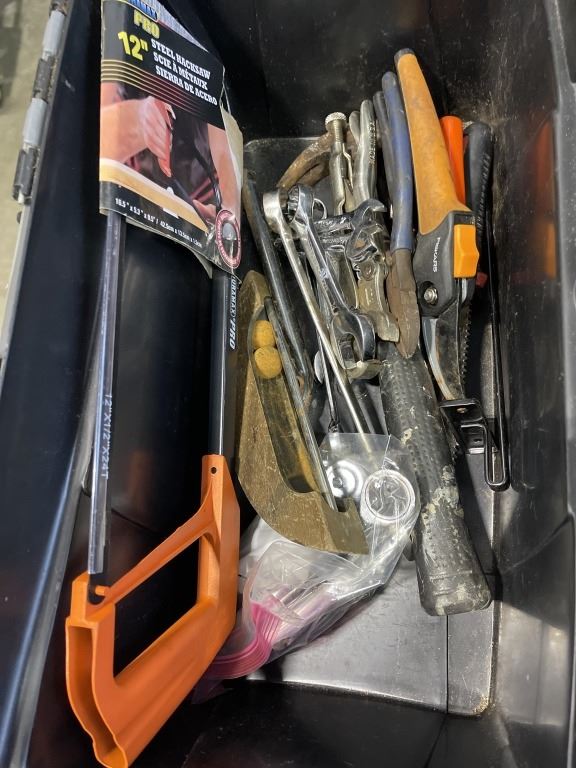 PLASTIC TOOL BOX AND ASSORTED HAND TOOLS