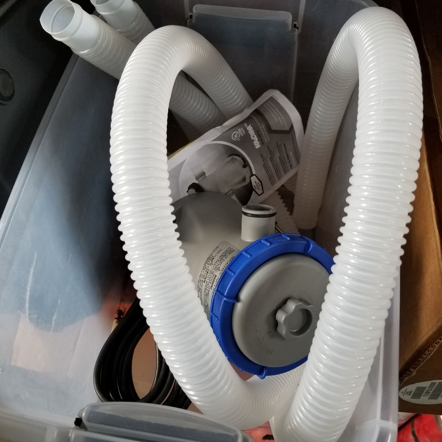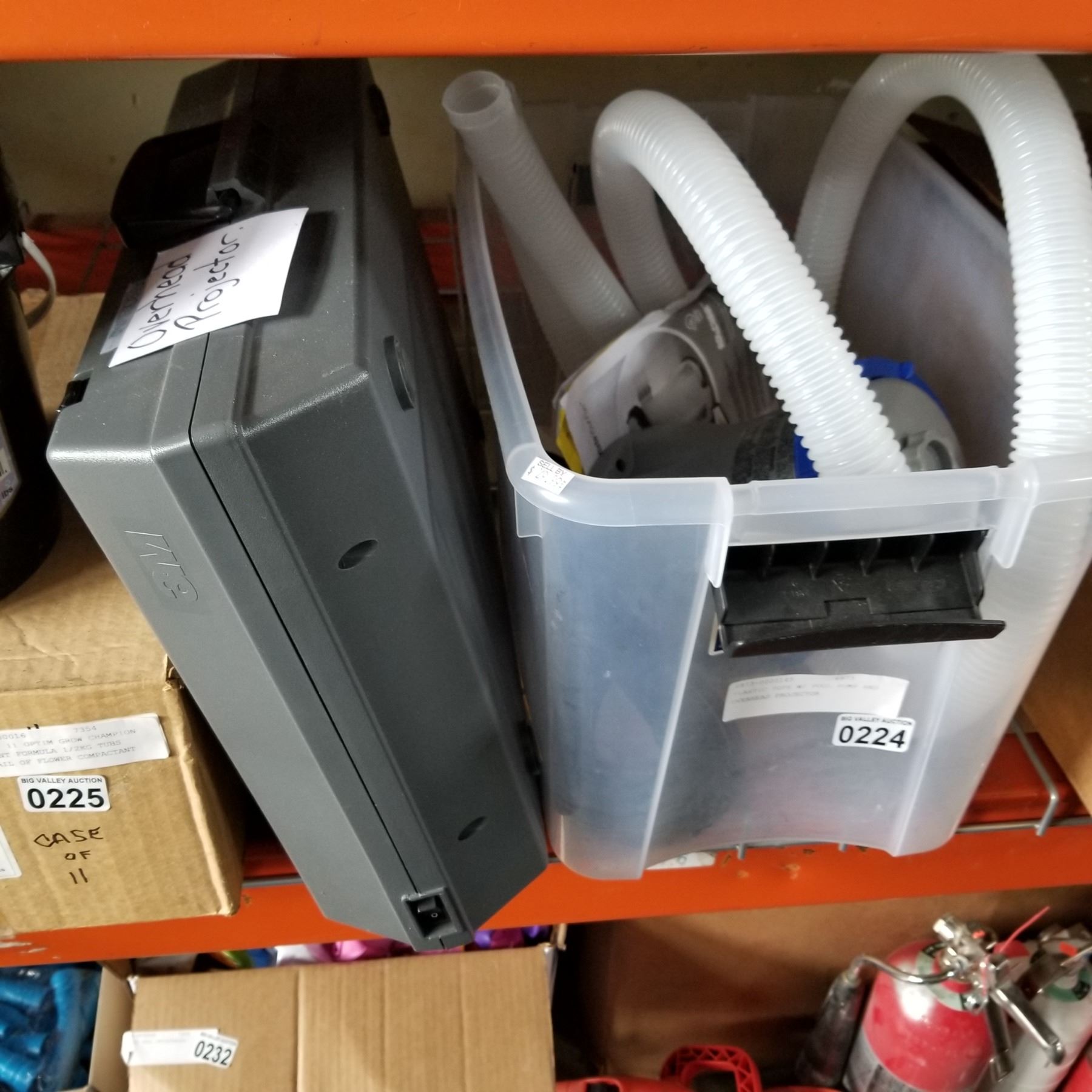 PLASTIC TOTE W/ POOL PUMP AND OVERHEAD PROJECTOR