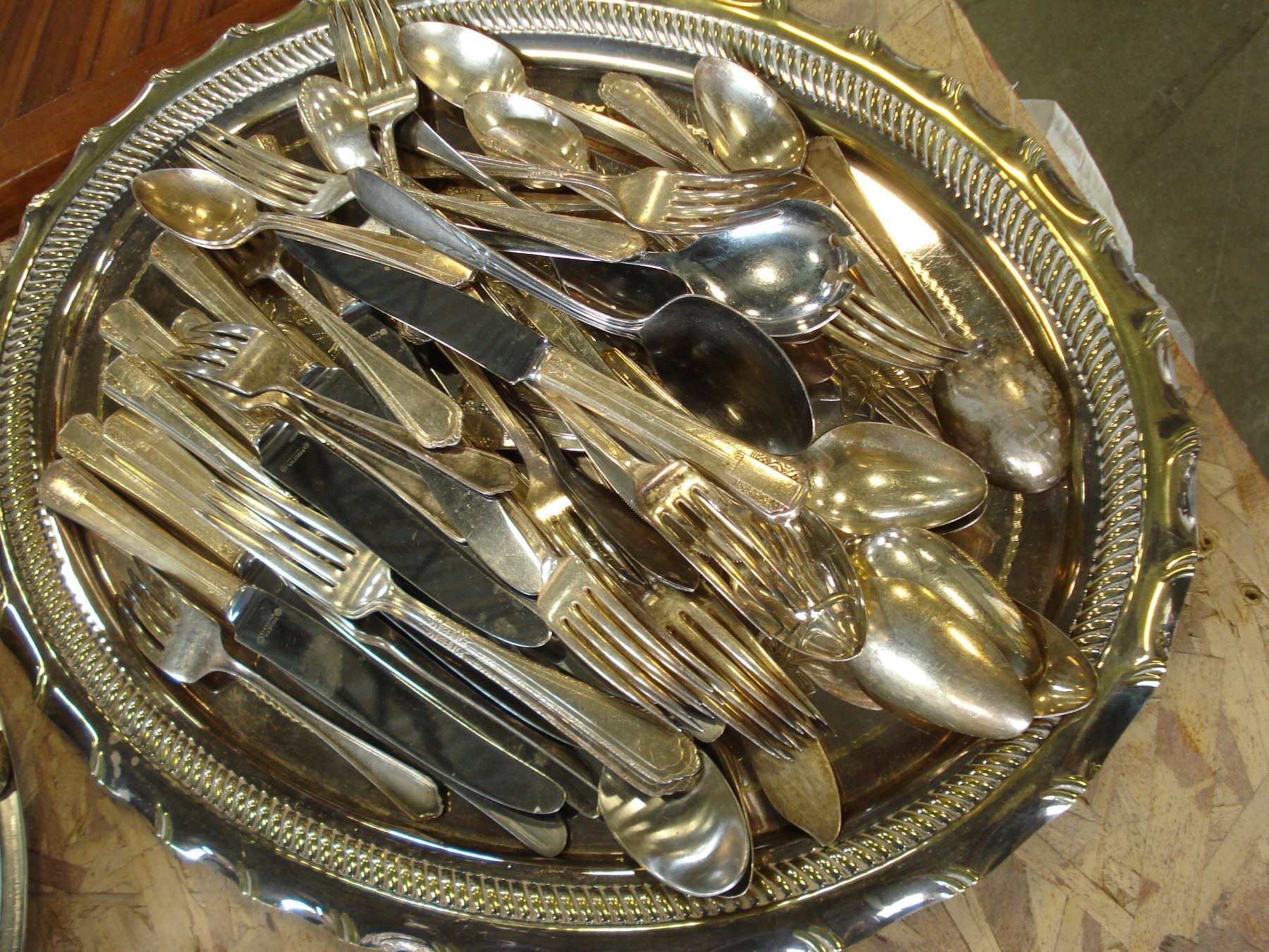 PLATTER OF CUTLERY PLATTER WITH SERVING PIECES AND CRYSTAL CONDIMENT HOLDERS ON CADDY