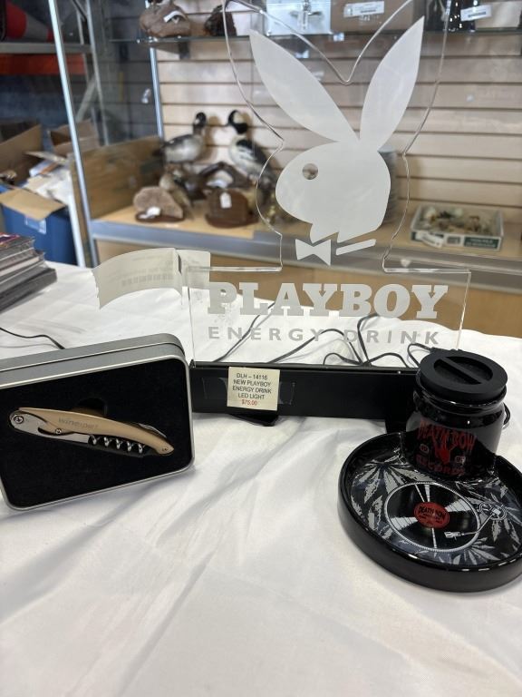 PLAYBOY LIGHT UP SIGN, DEATH ROW RECORDS ASH TRAY AND WINE CORKSCREW