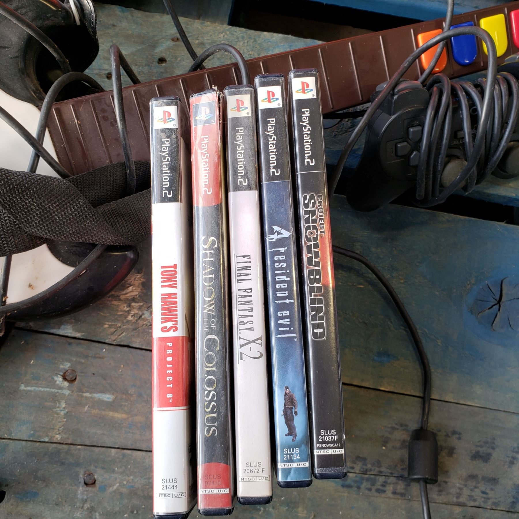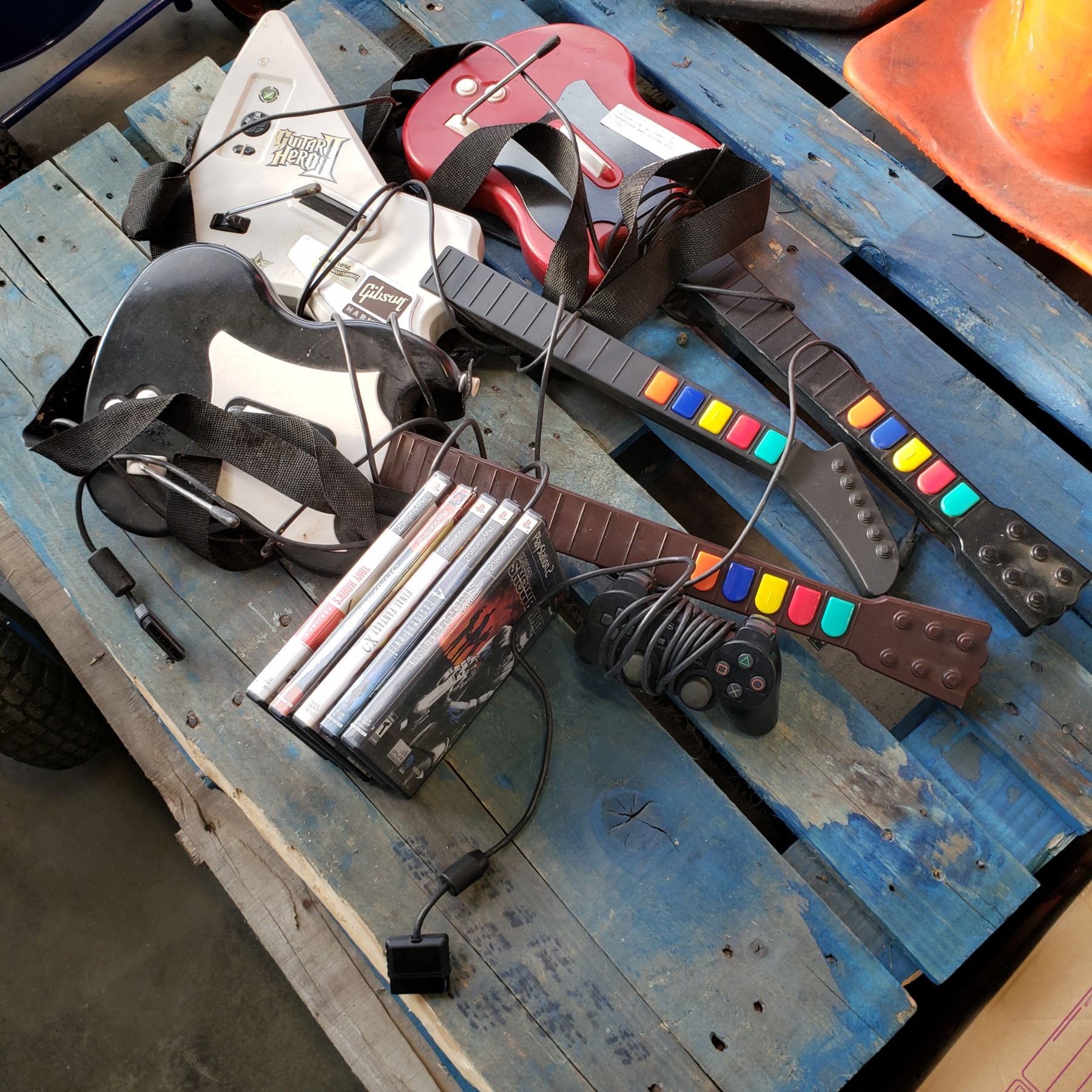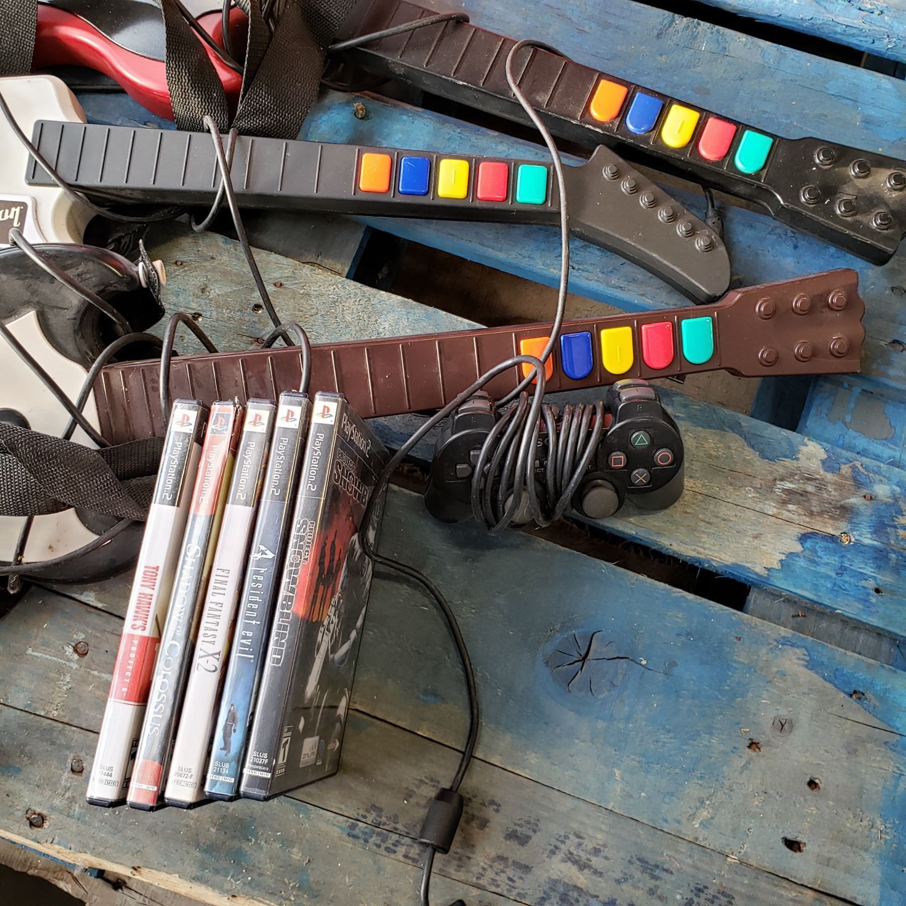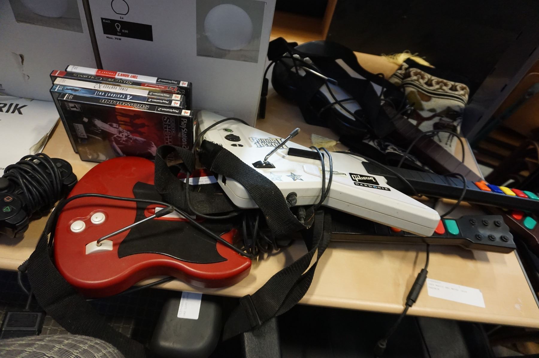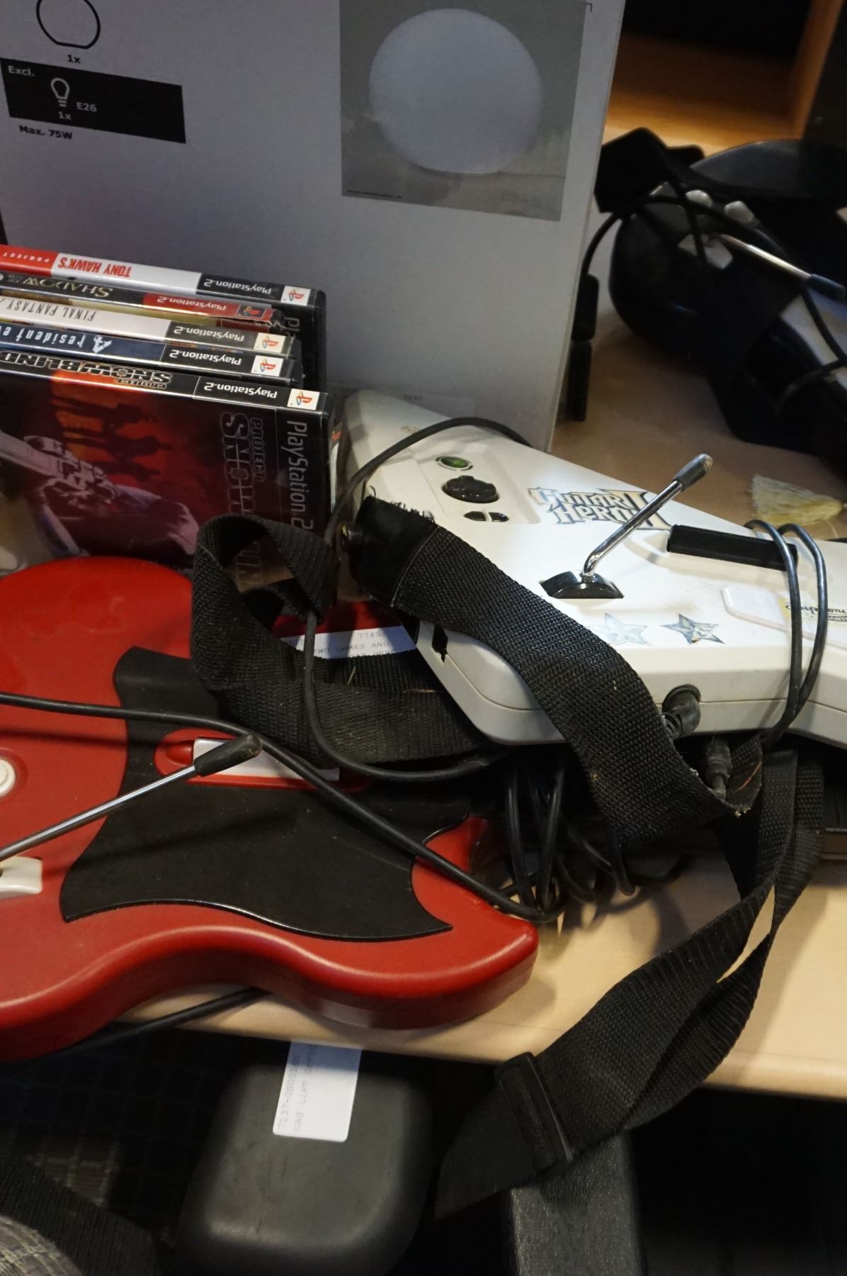 PLAYSTATION TWO GAMES AND CONTROLLER AND GUITAR HERO GUITARS