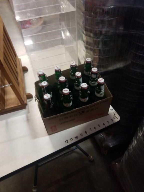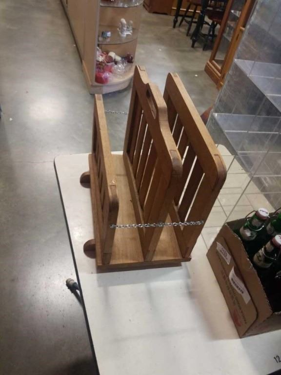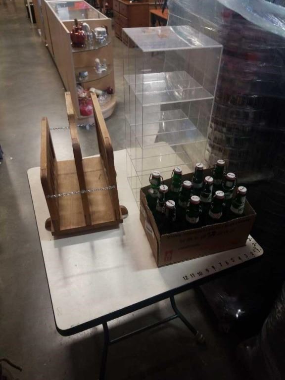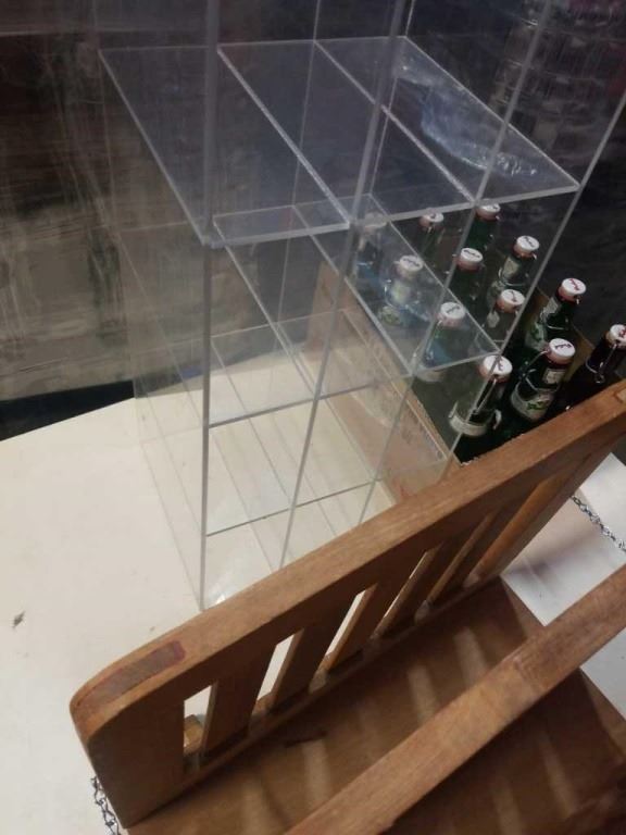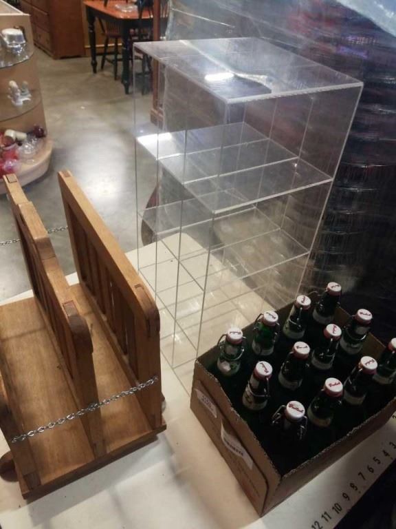 PLEXI ORGANIZER, WOOD MAGAZINE RACKA ND VINTAGE GLASS BOTTLES