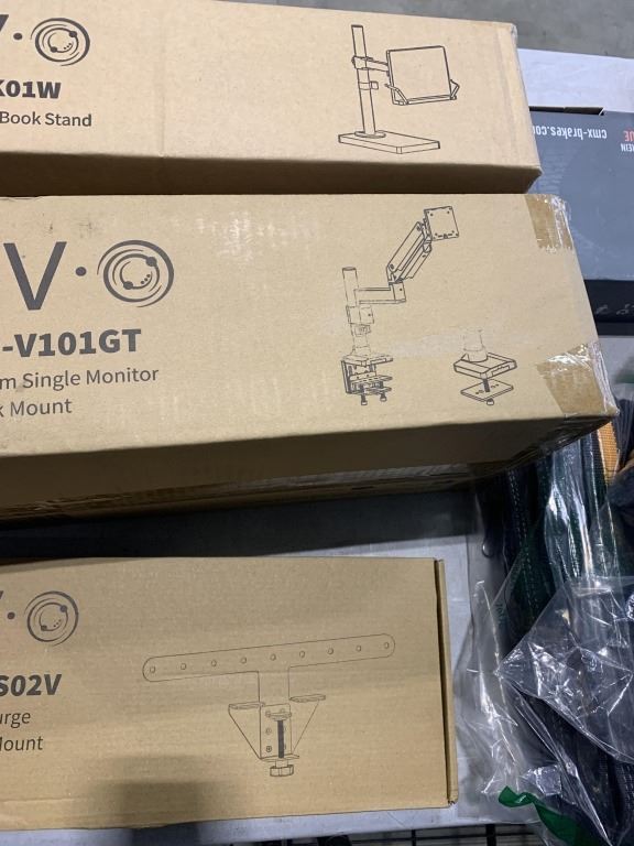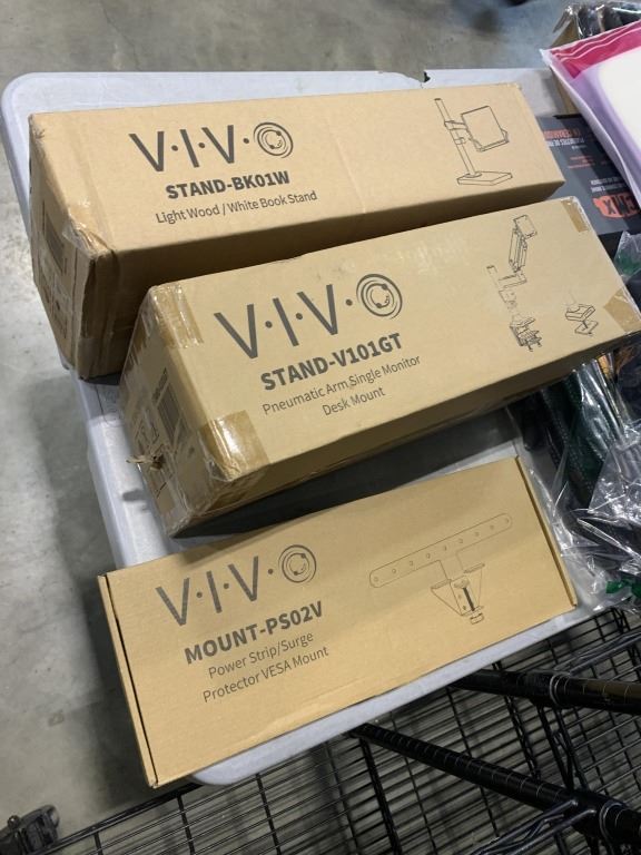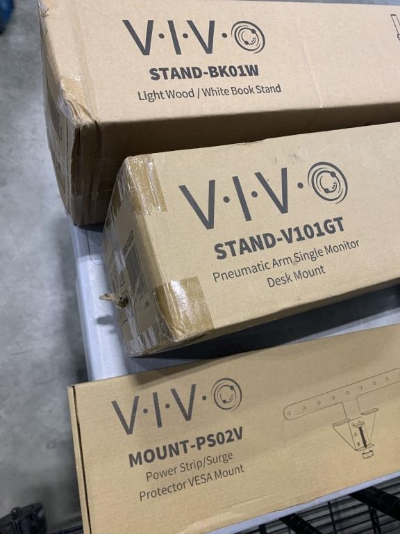 PNEUMATIC ARM SINGLE MONITOR DESK MOUNT, LIGHT WOOD/WHITE BOOK STAND AND POWER STRIP/SURGE PROTECTOR VESA MOUNT