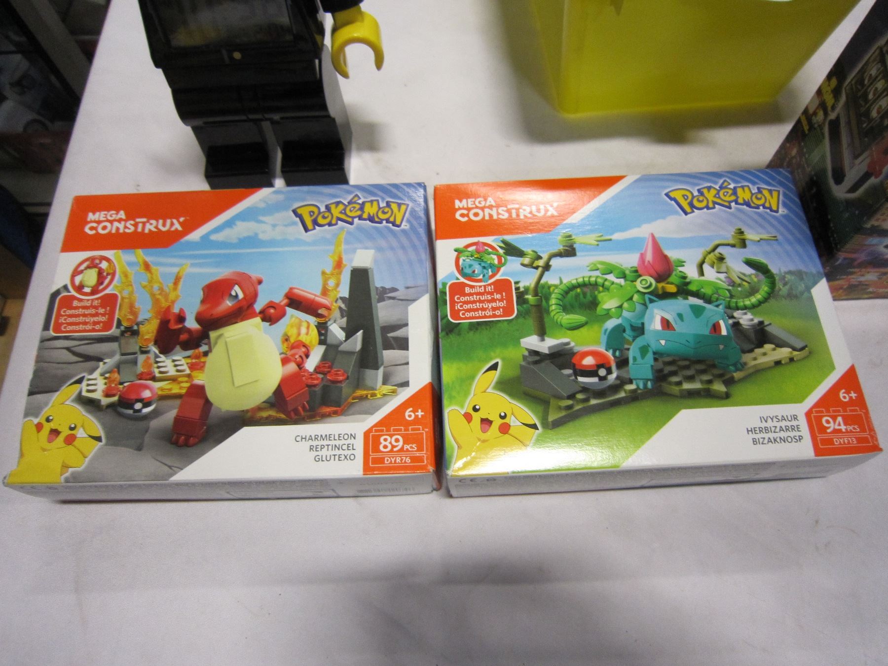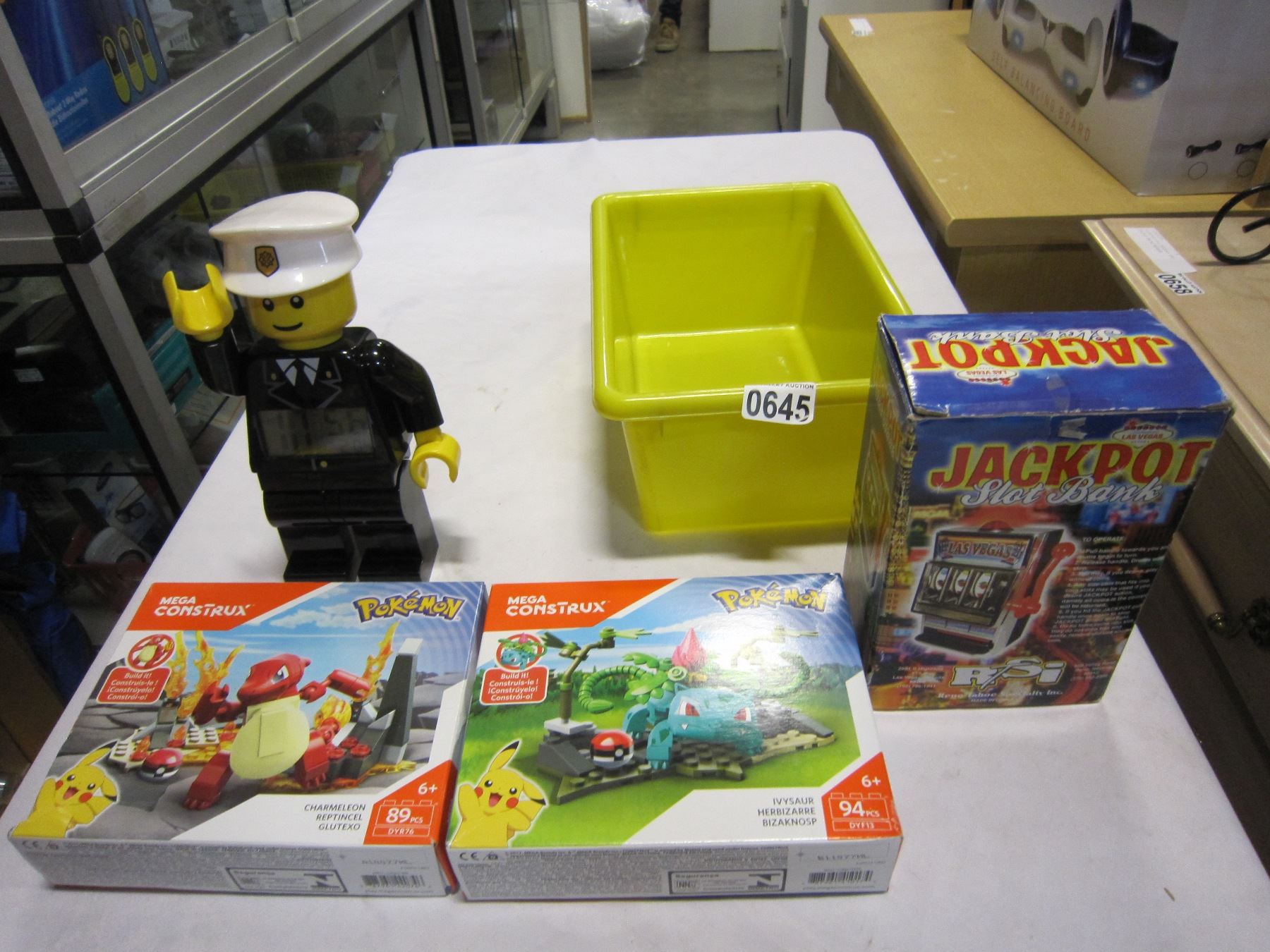POKEMON LEGO FIGURES, SMALL SLOT MACHINE, AND LEGO CLOCK