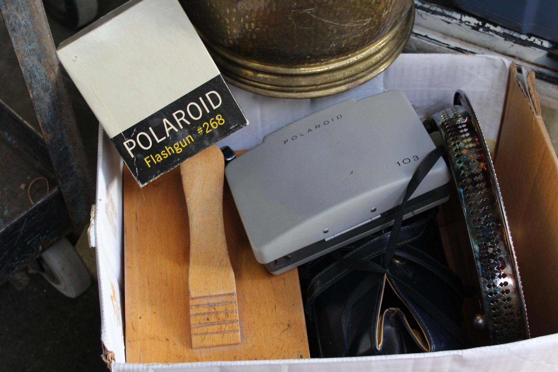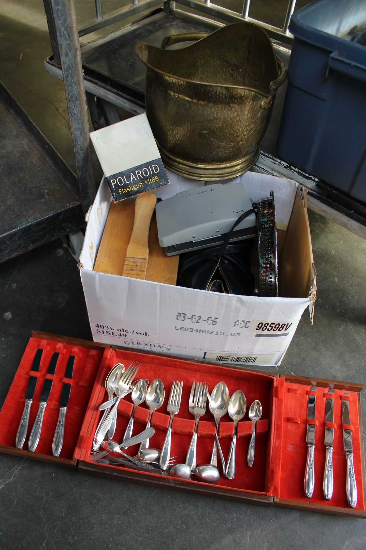 POLAROID CAMERA CUTLERY CANTEEN WITH ANTIQUE CUTLERY AND SHOE POLISHING STAND AND BRASS PAIL