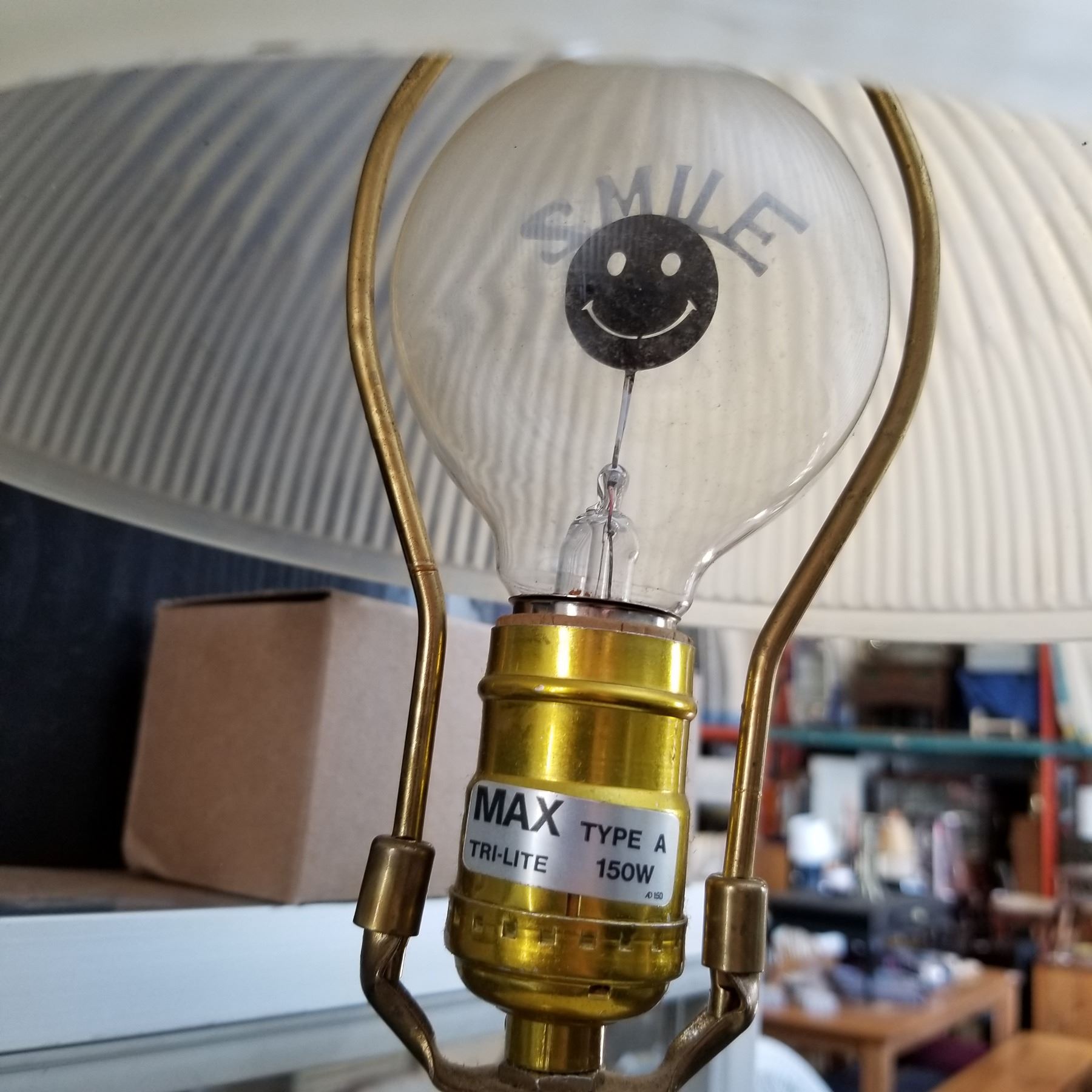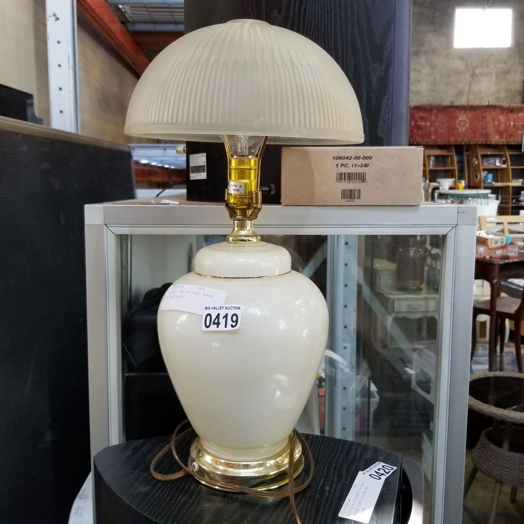 PORCELAIN LAMP W/ GLASS SHADE AND SMILE BULB