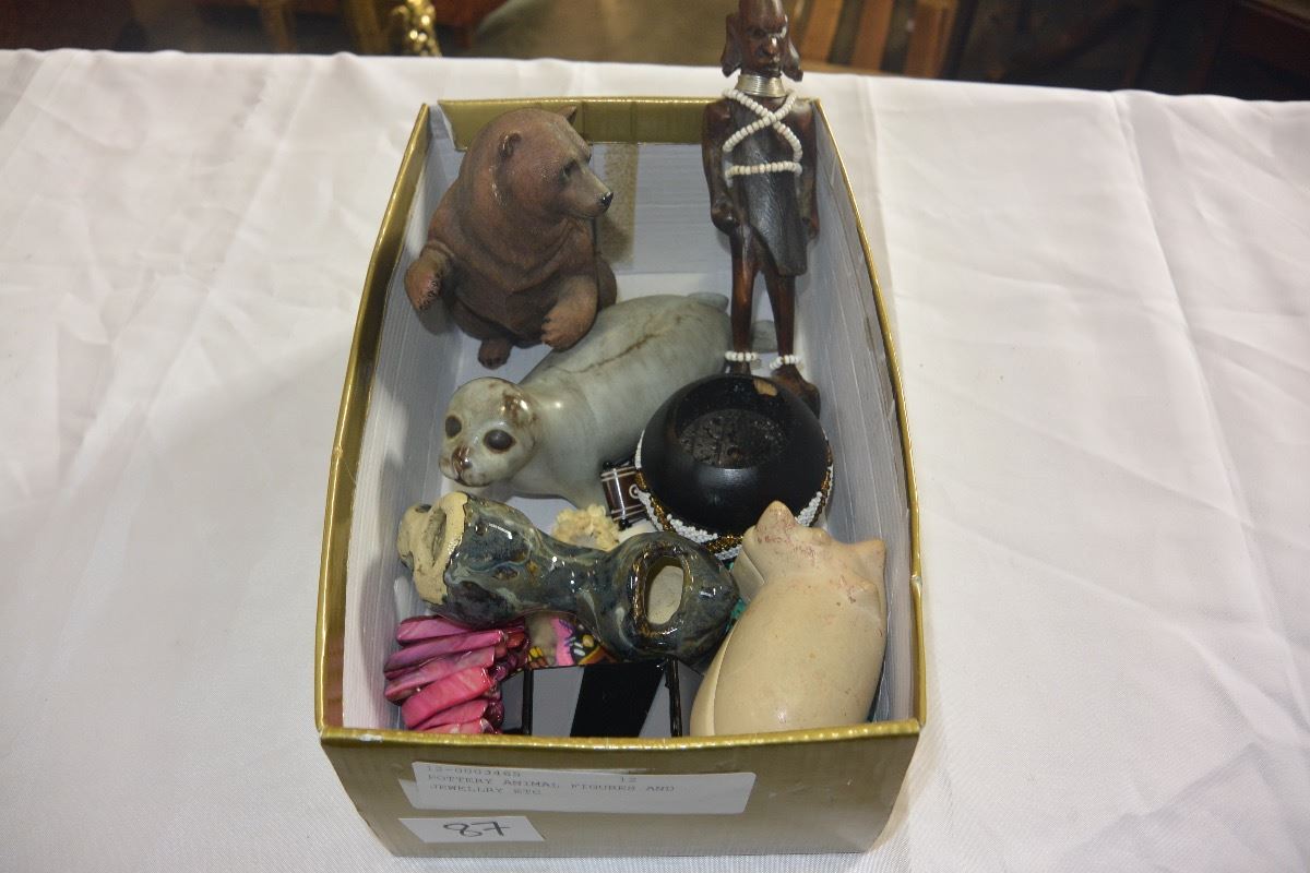POTTERY ANIMAL FIGURES AND JEWELLRY ETC