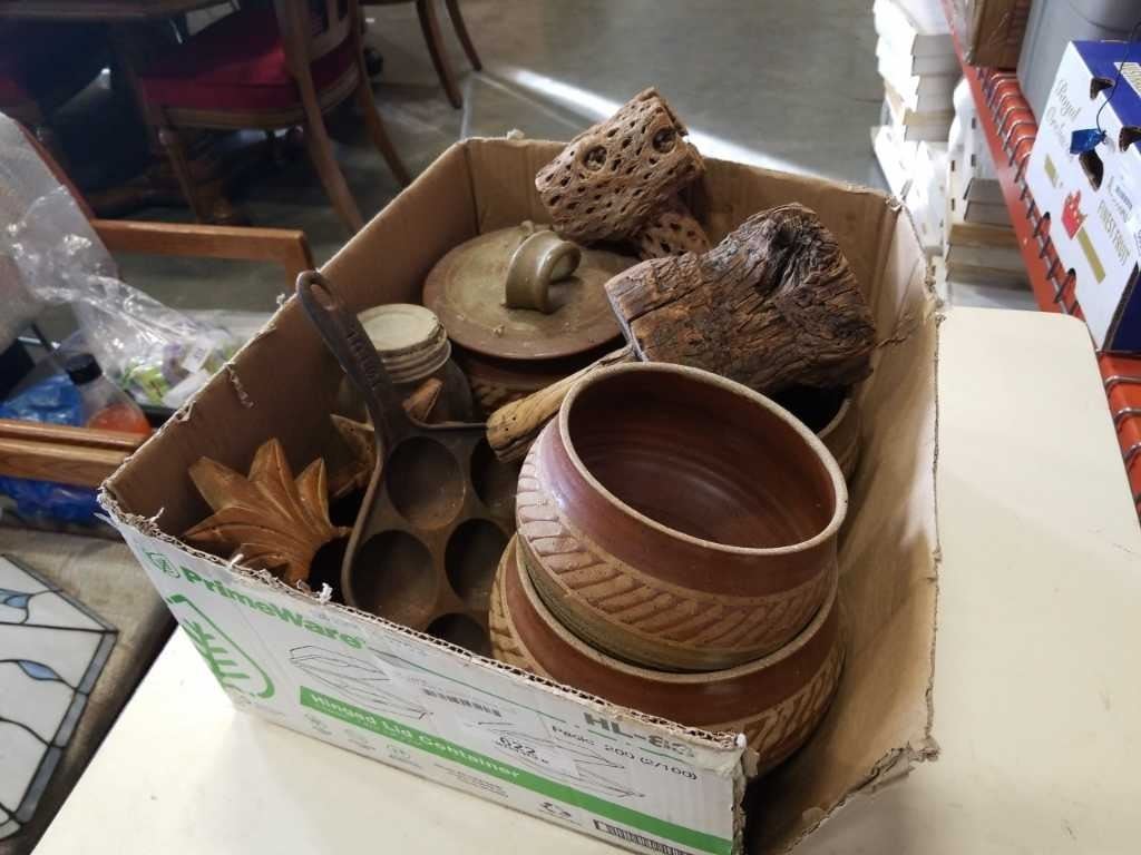 POTTERY BOWLS, WOOD CARVINGS, CAST IRON PAN