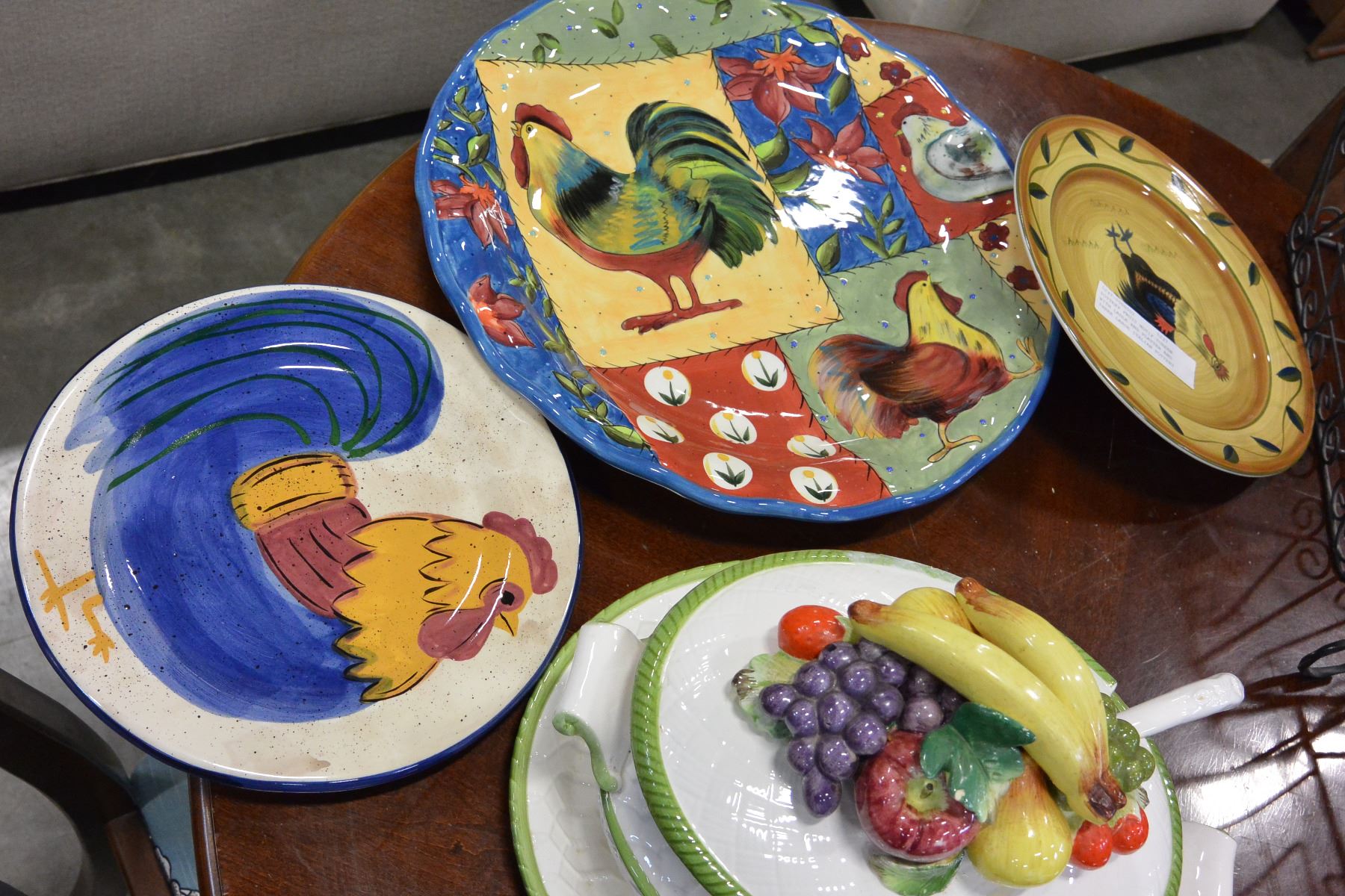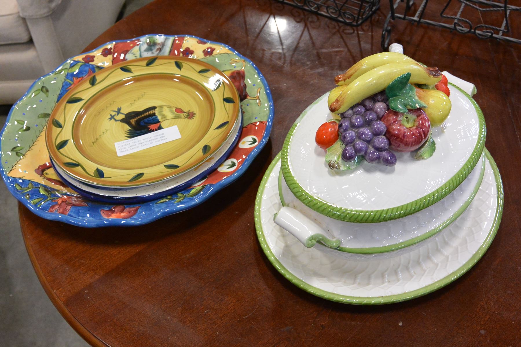 POTTERY FRUIT MOTIF TUREEN WITH LADLE AND PLATTER AND THREE LARGE ITALIAN POTTERY SERVING PLATTERS