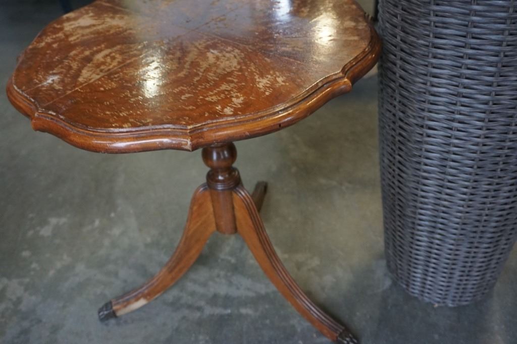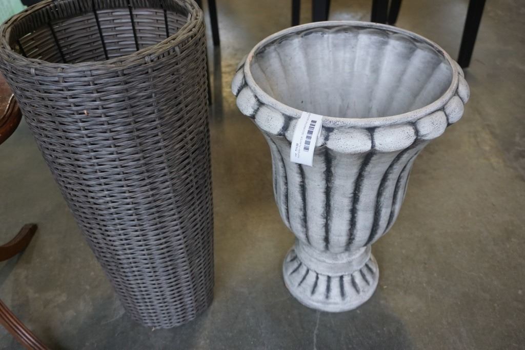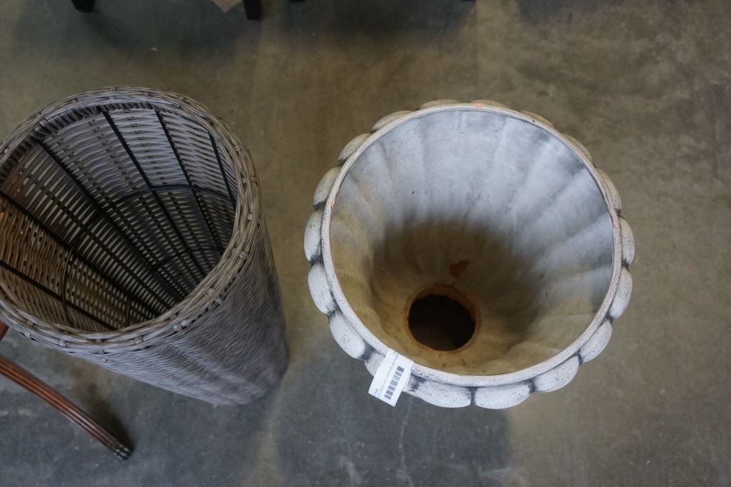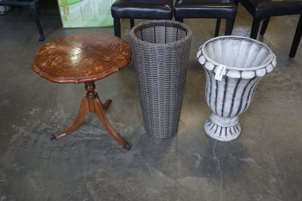 POTTERY PLANTER, DECORATIVE WICKER VASE AND WOOD PARLOUR TABLE