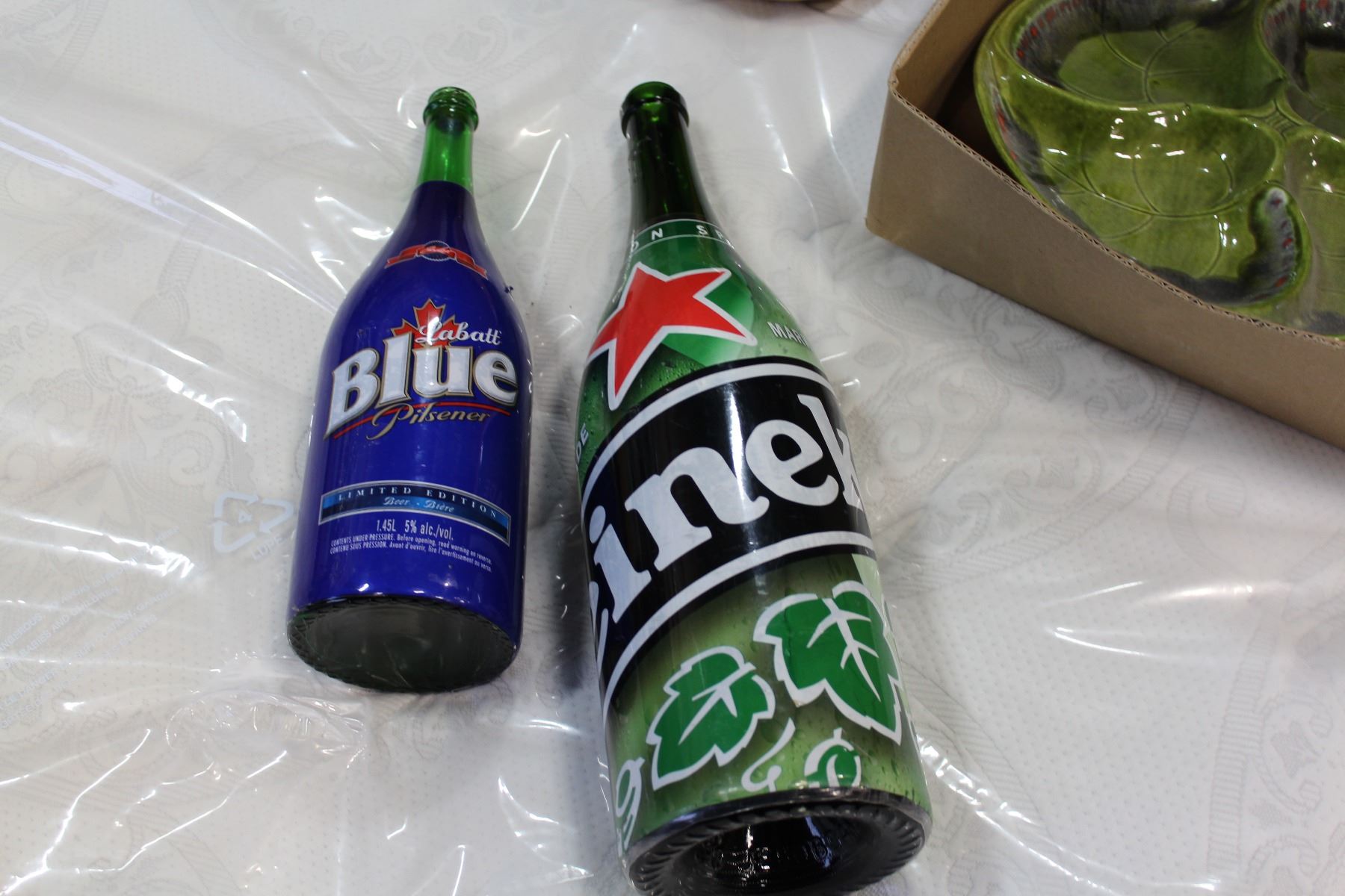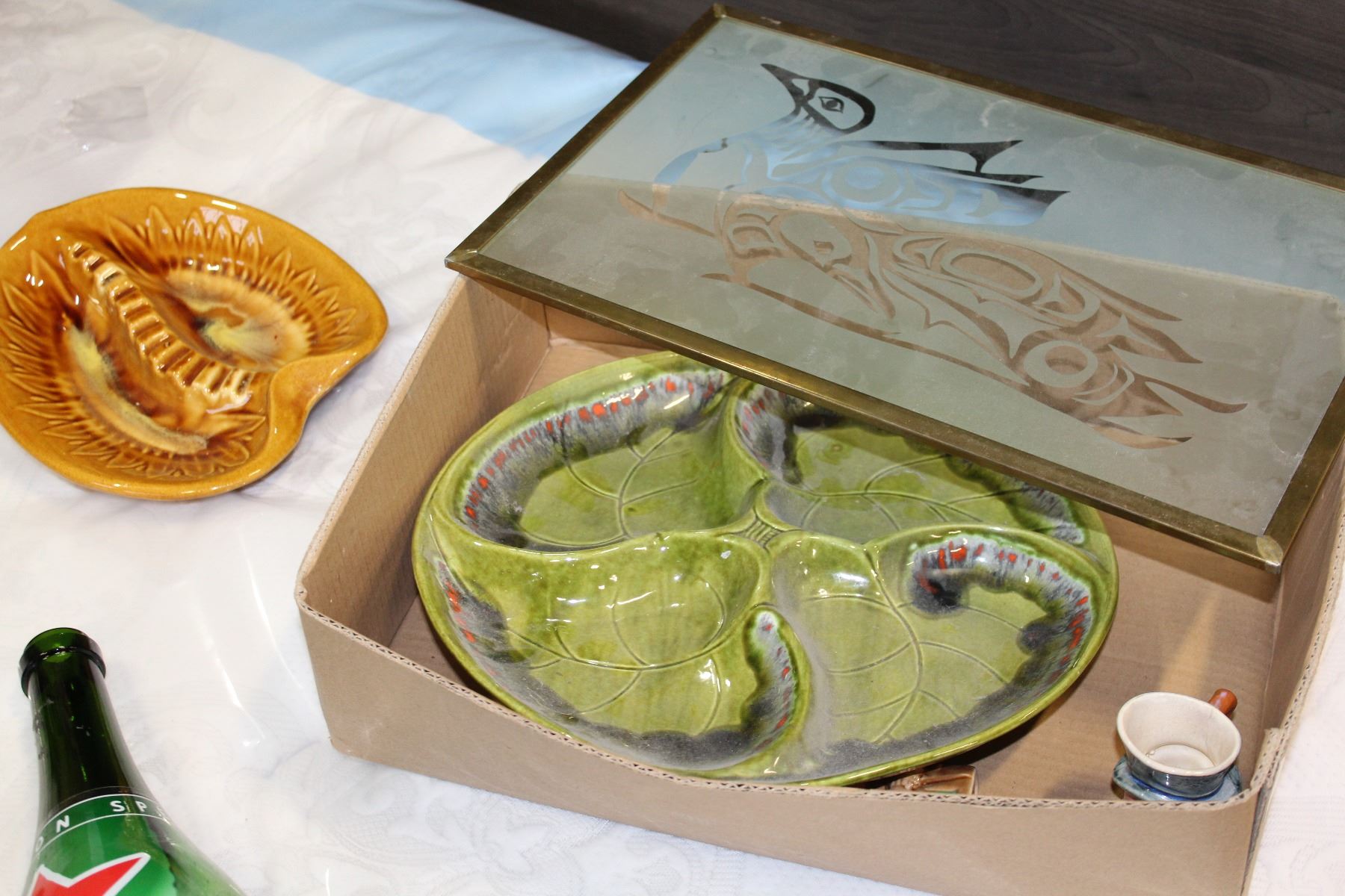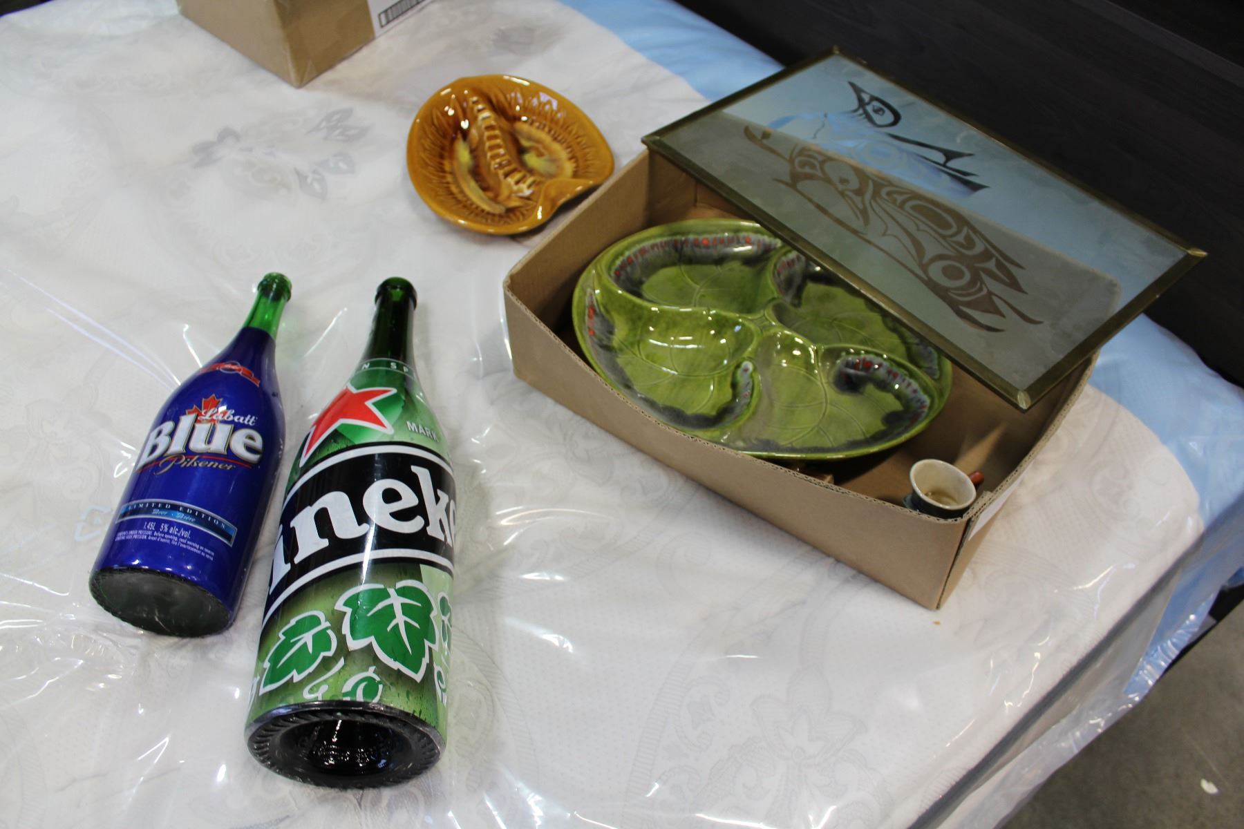 POTTERY PLATTERS ETCHED GLASS AND COLLECTIBLE BOTTLES