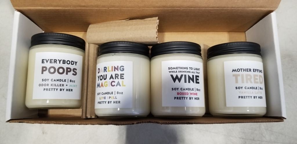 PRETTY BY HER CANDLE SET OF 4 WITH FUNNY SAYINGS, RETAIL $96