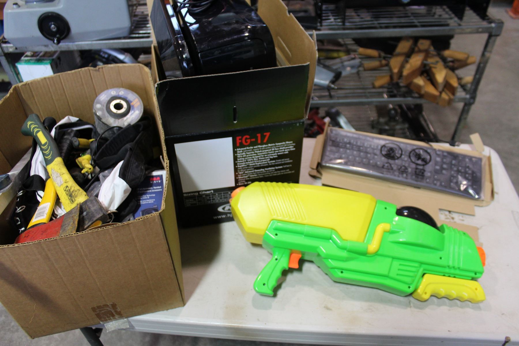 PRINTER KEYBOARD AND BOX OF TOOLS AND WATER GUN