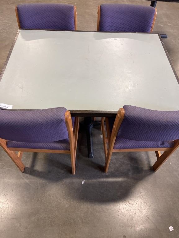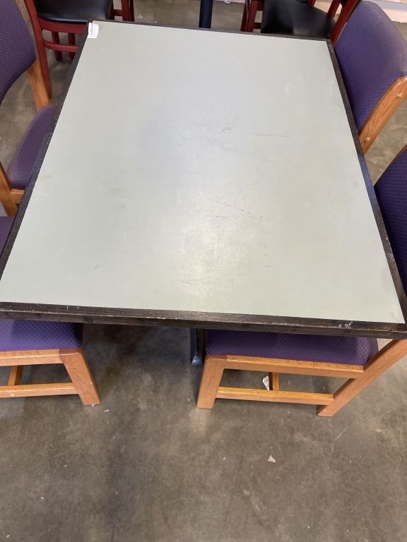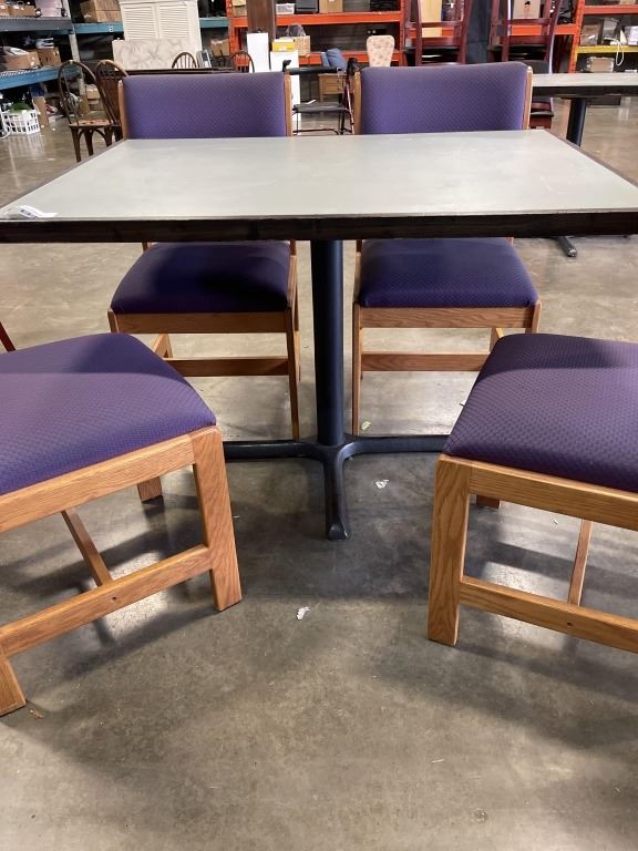 PUB DINING TABLE WITH CAST IRON BASE, AND 4 UPHOLSTERED DINING CHAIRS, TABLE IS 46 X 34