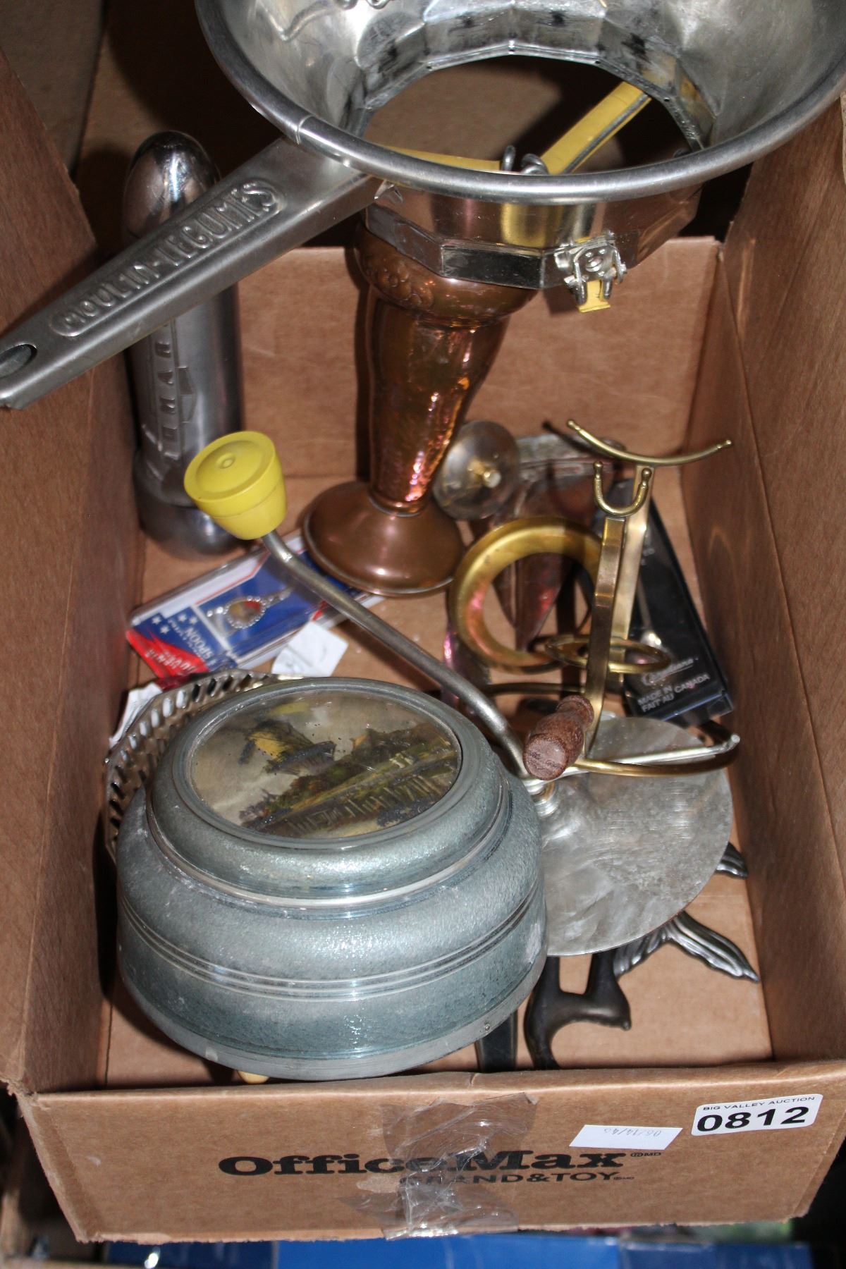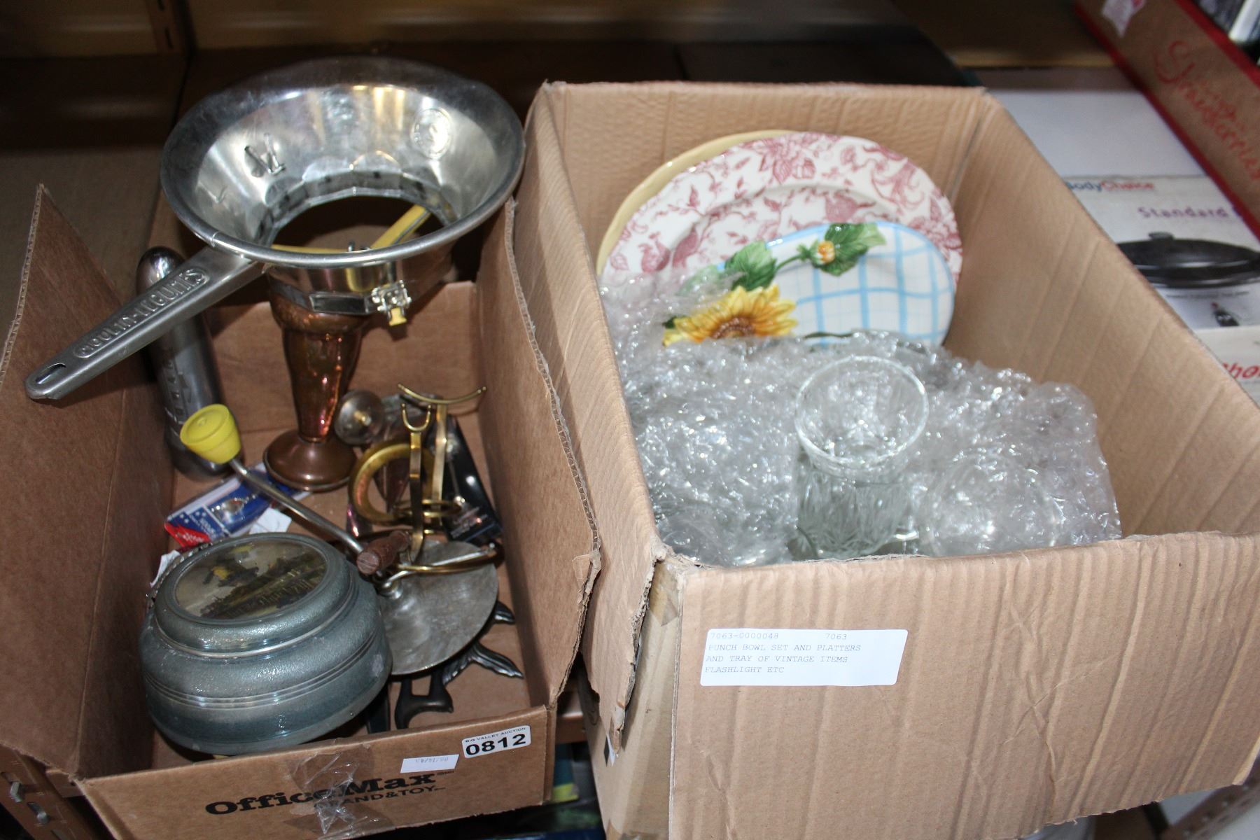 PUNCH BOWL SET AND PLATTERS AND TRAY OF VINTAGE ITEMS FLASHLIGHT ETC