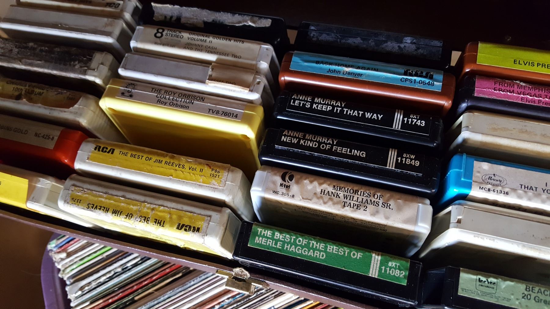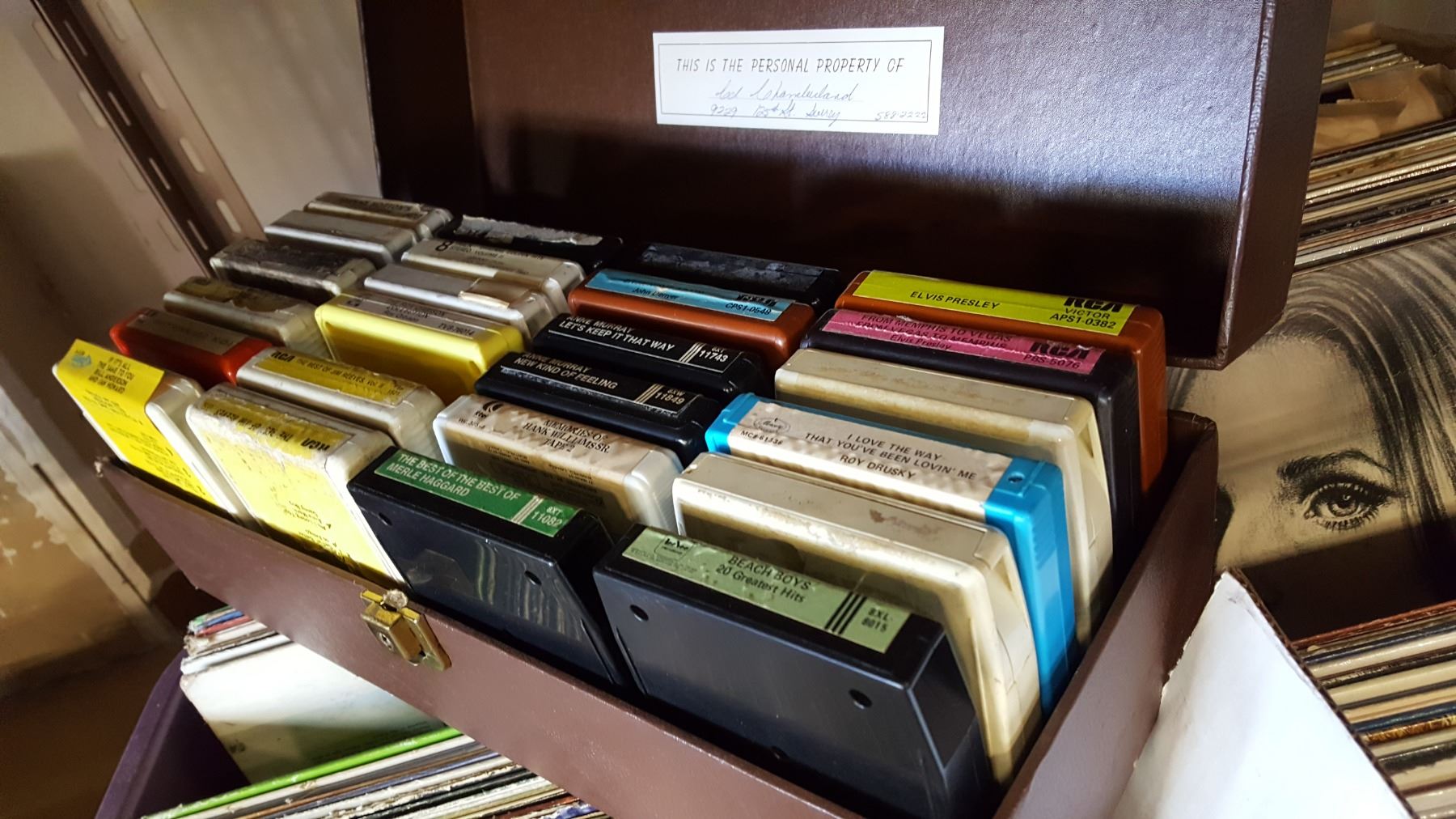 PURPLE TOTE OF RECORDS AND CASE OF 8 TRACKS