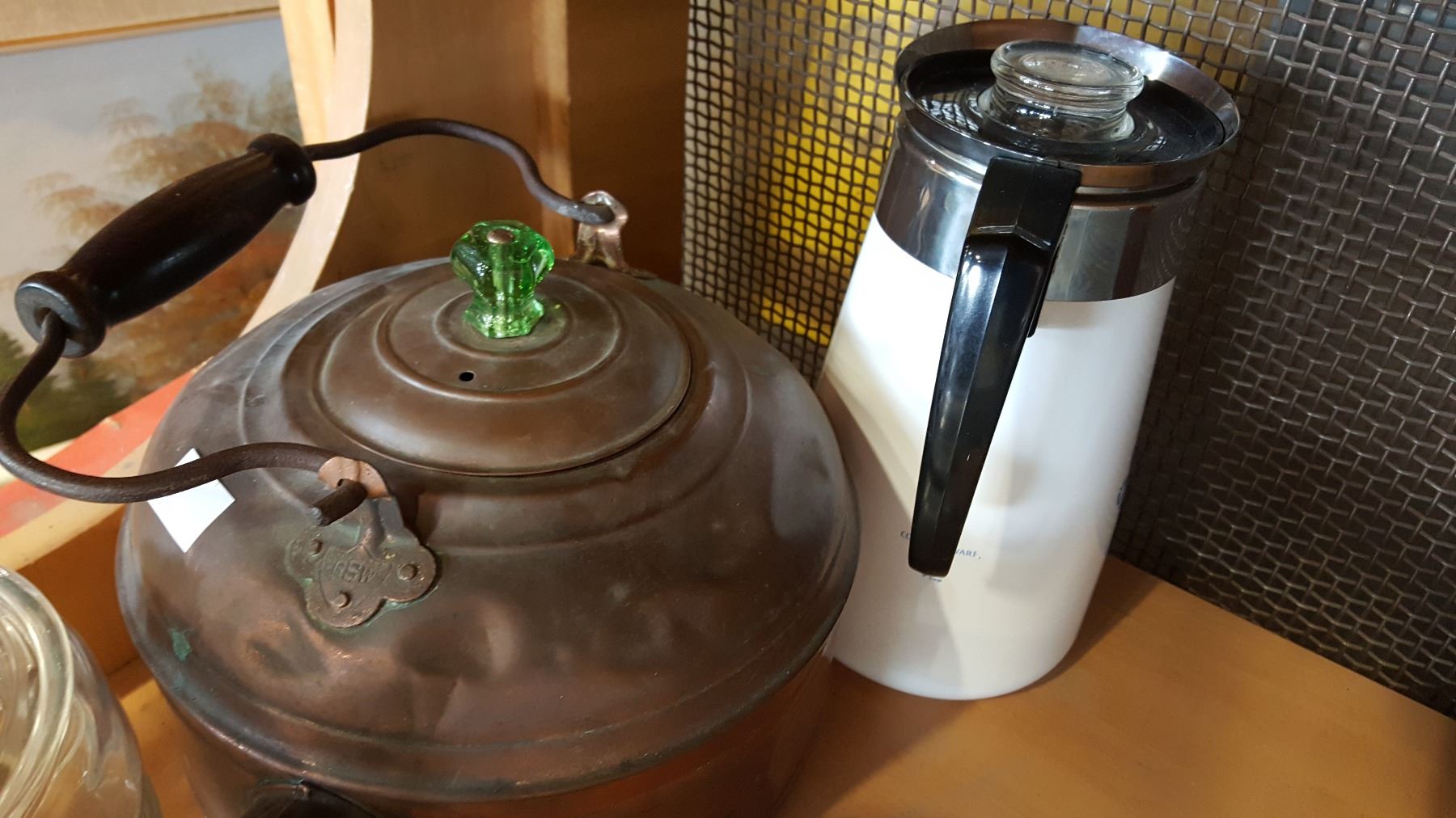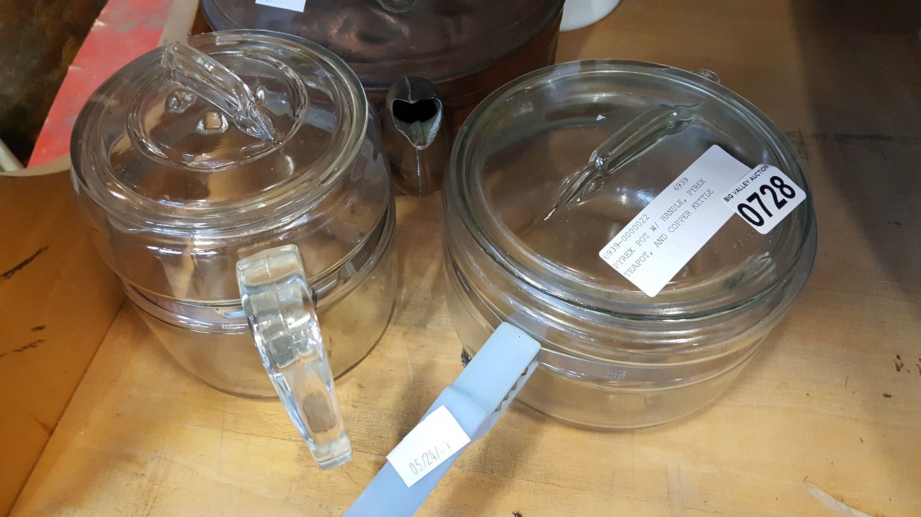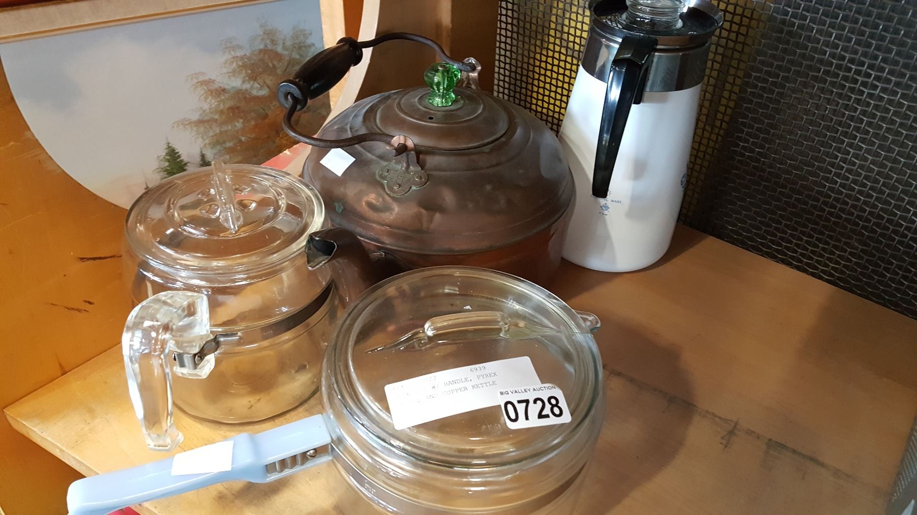 PYREX POT W/ HANDLE, PYREX TEAPOT, AND COPPER KETTLE