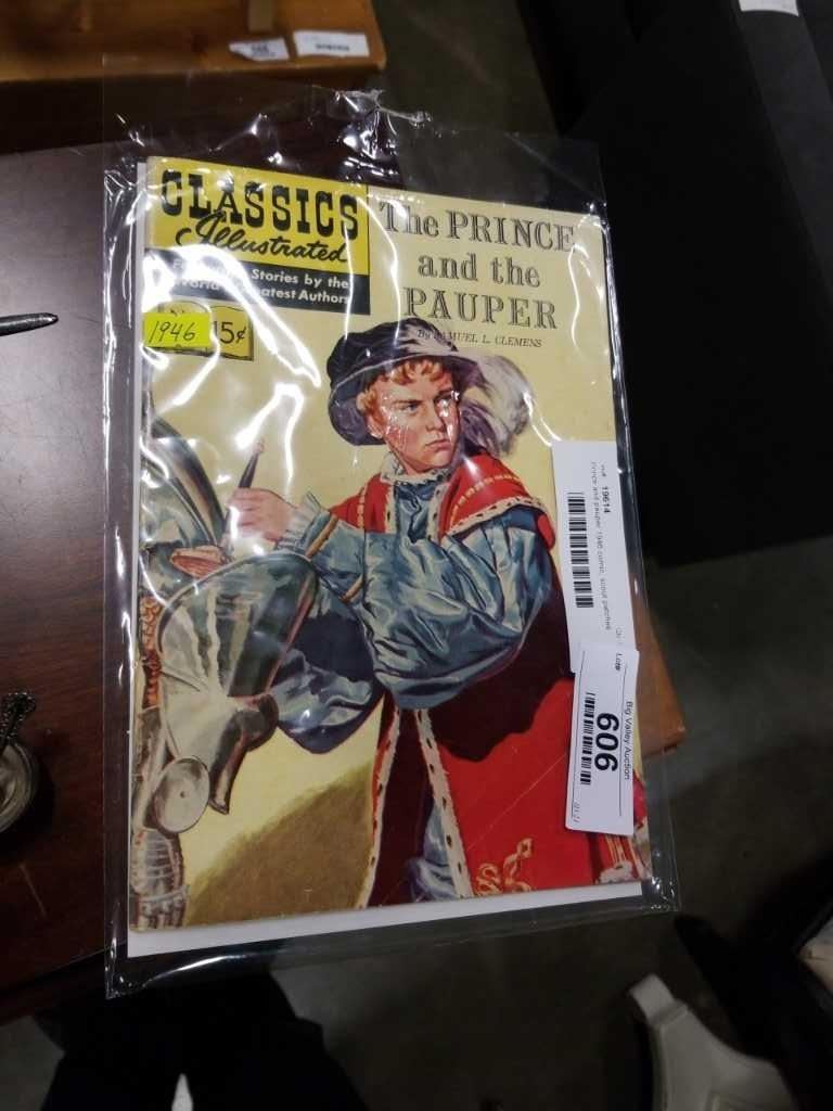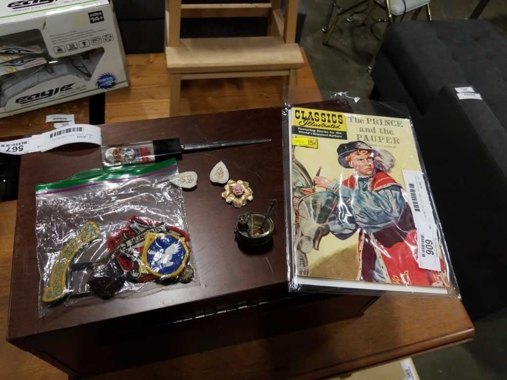 Prince and pauper 1946 comic, scout patches and sterling wash bin with broach