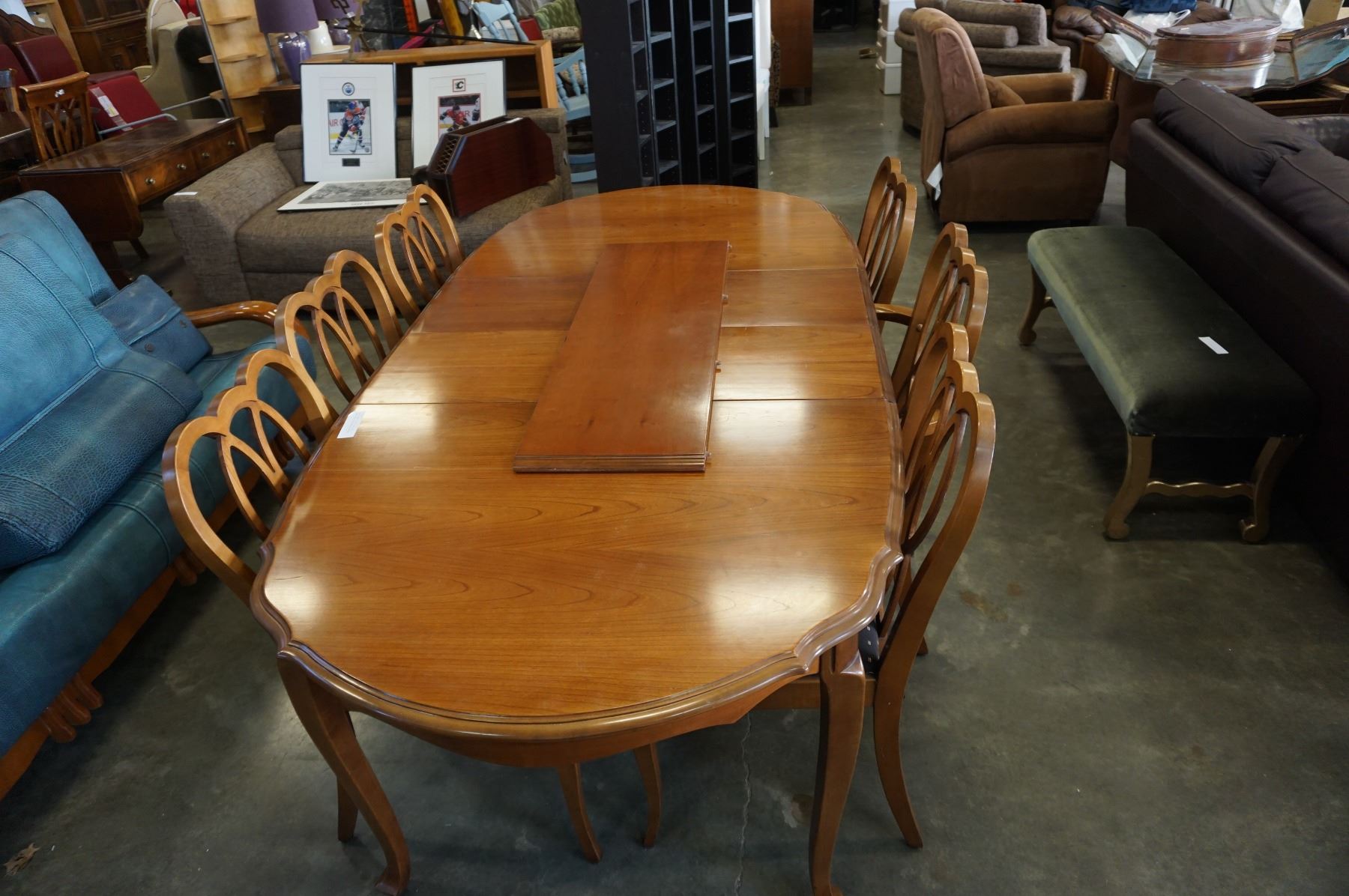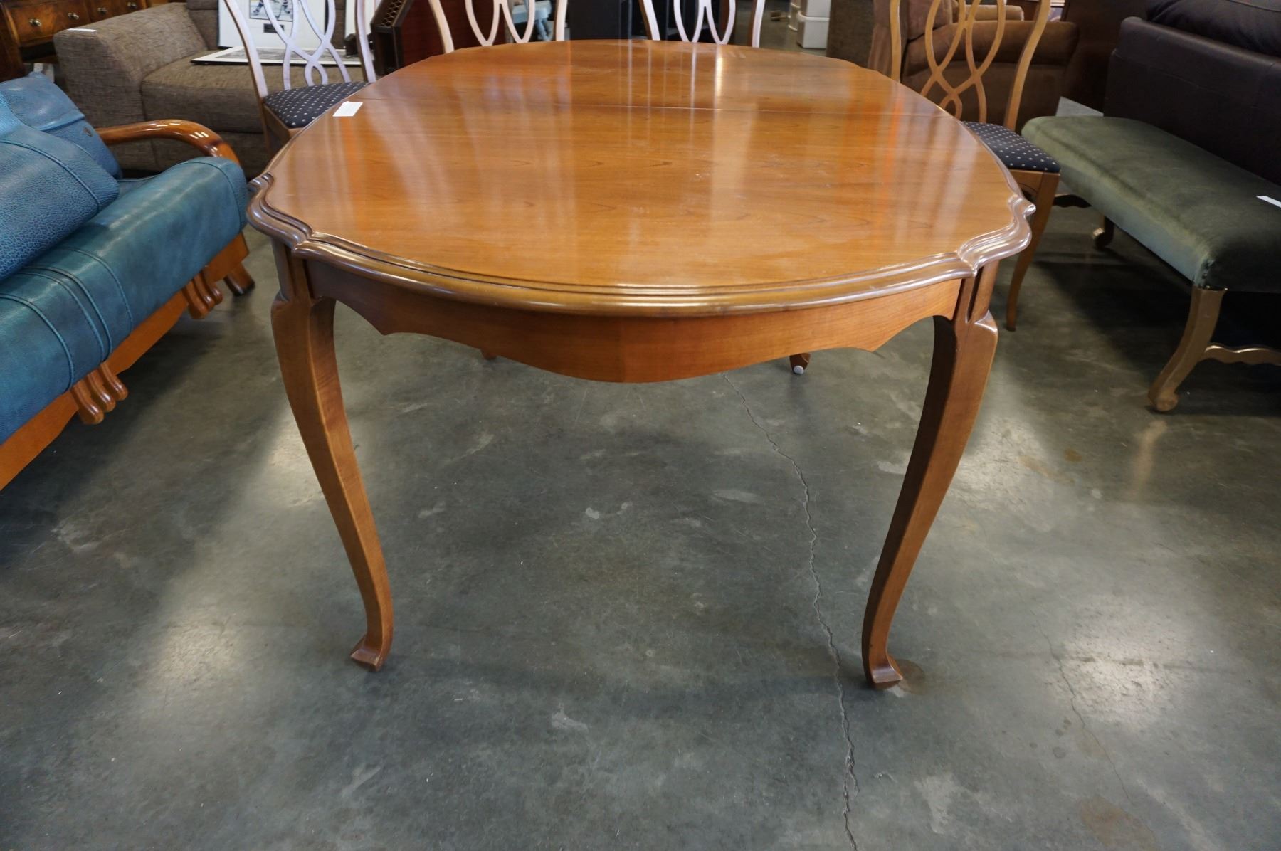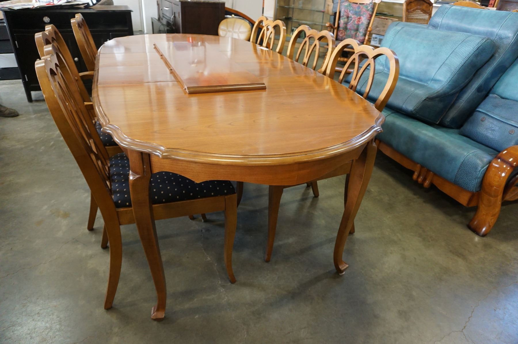 QUEEN ANNE DINING TABLE W/ 3 LEAFS AND 6 FRUITWOOD CHAIRS