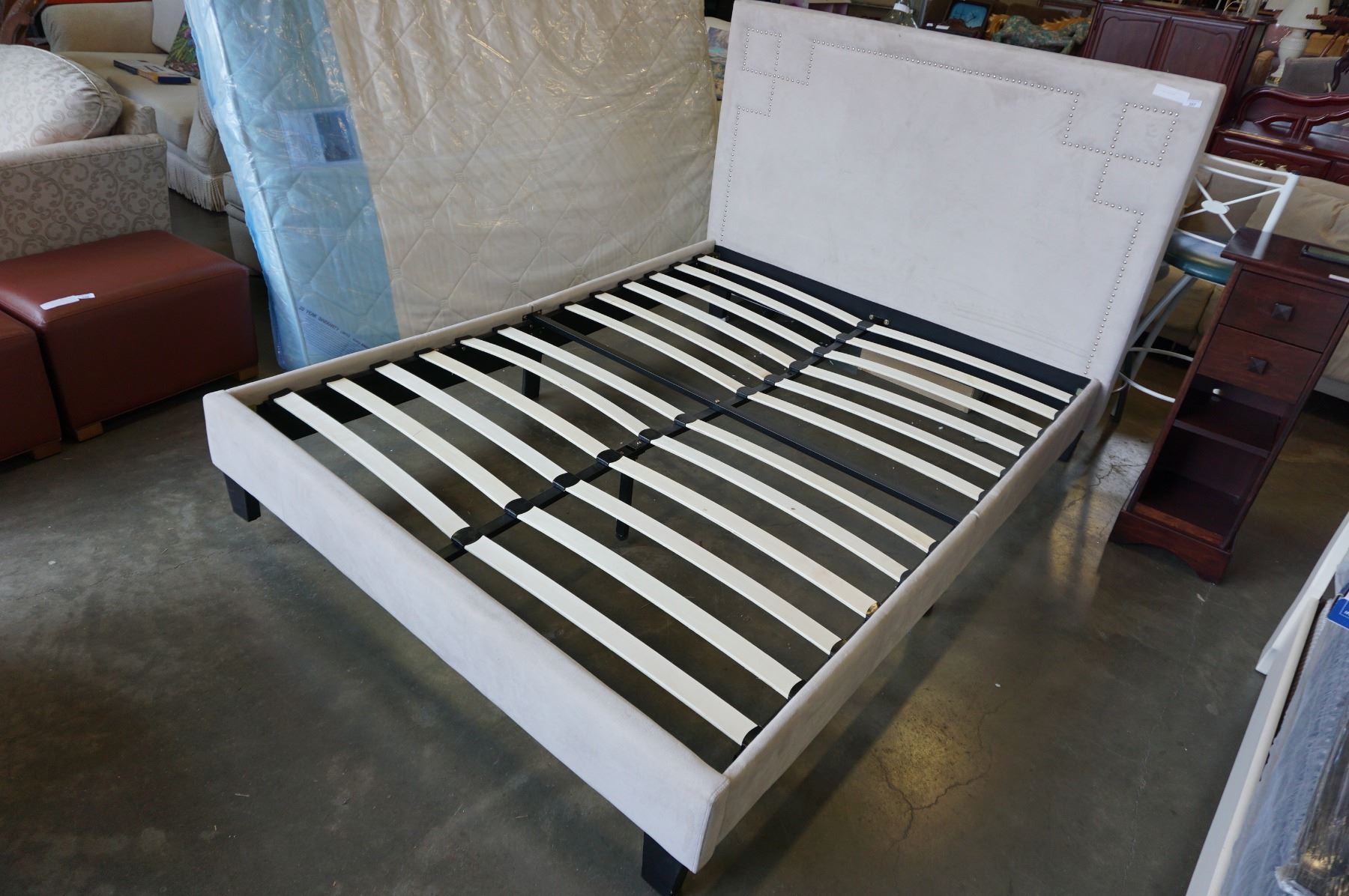 QUEEN SIZE BEIGE MICROFIBER W/ NAIL ACCENTS BEDFRAME