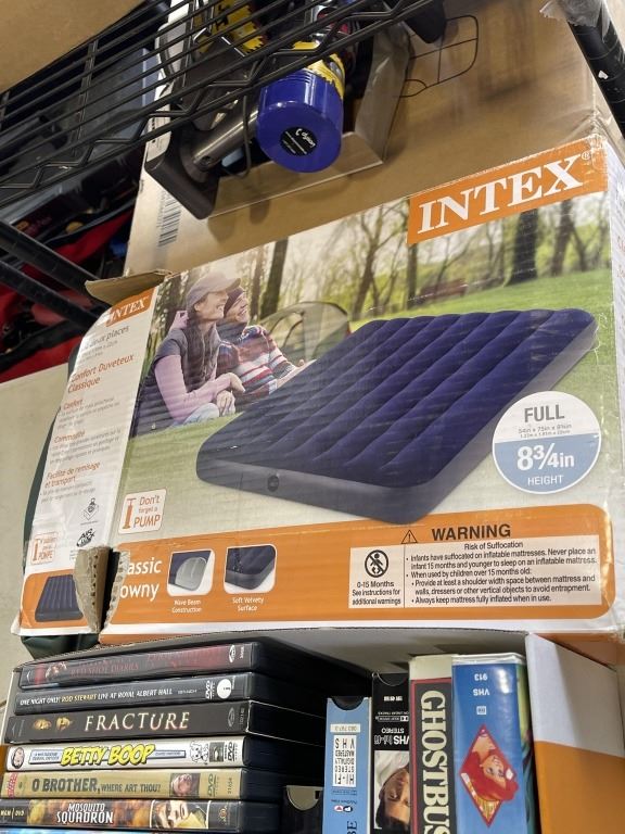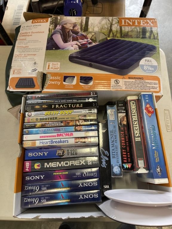 QUEENSIZE AIR MATTRESS, ASSORTED DVDS AND KITCHEN SCALE