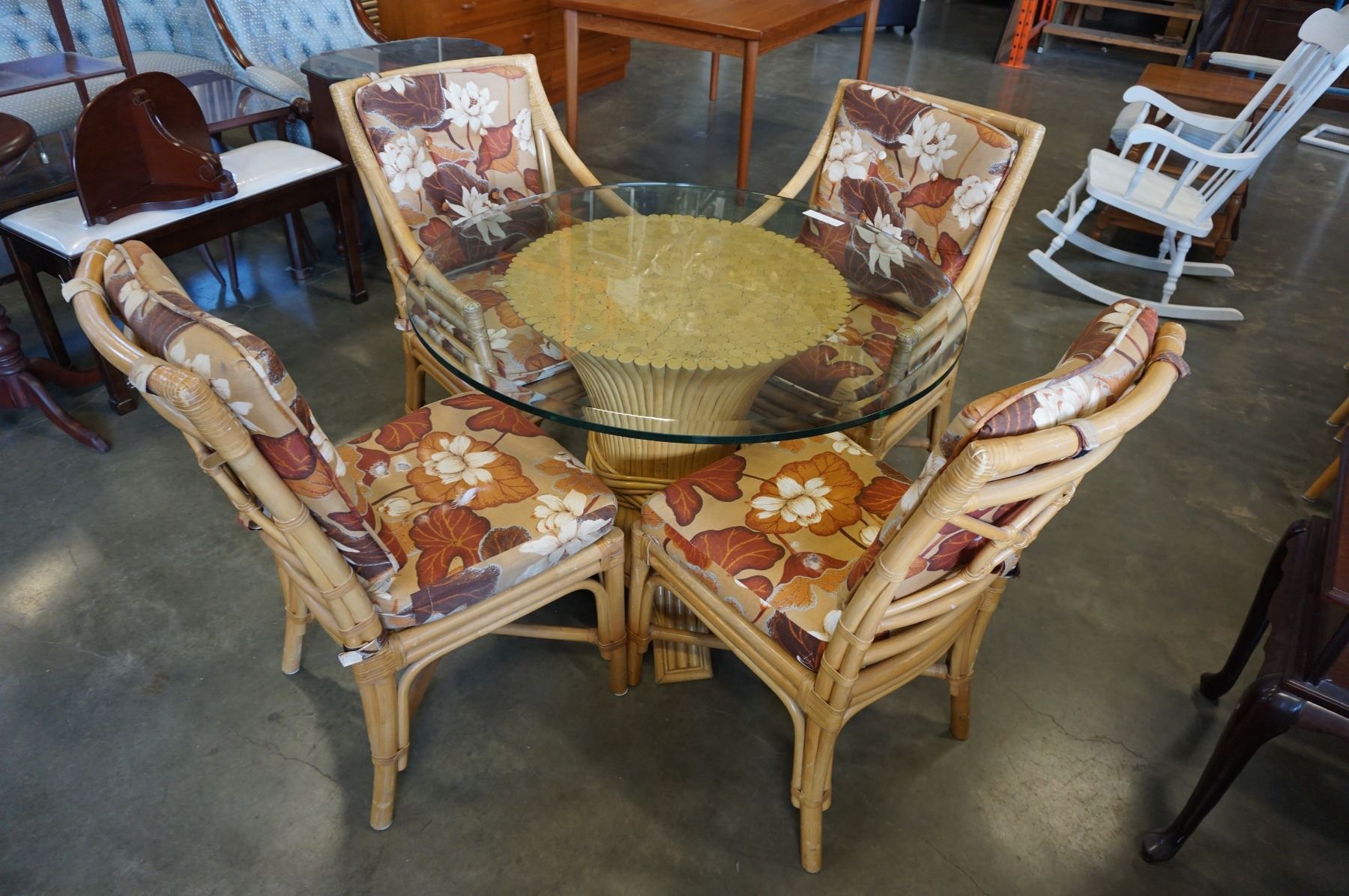 RATTAN BASE GLASS TOP DINING TABLE W/ 4 CHAIRS