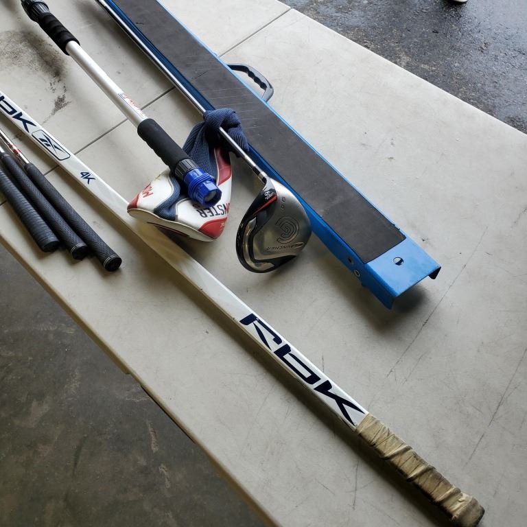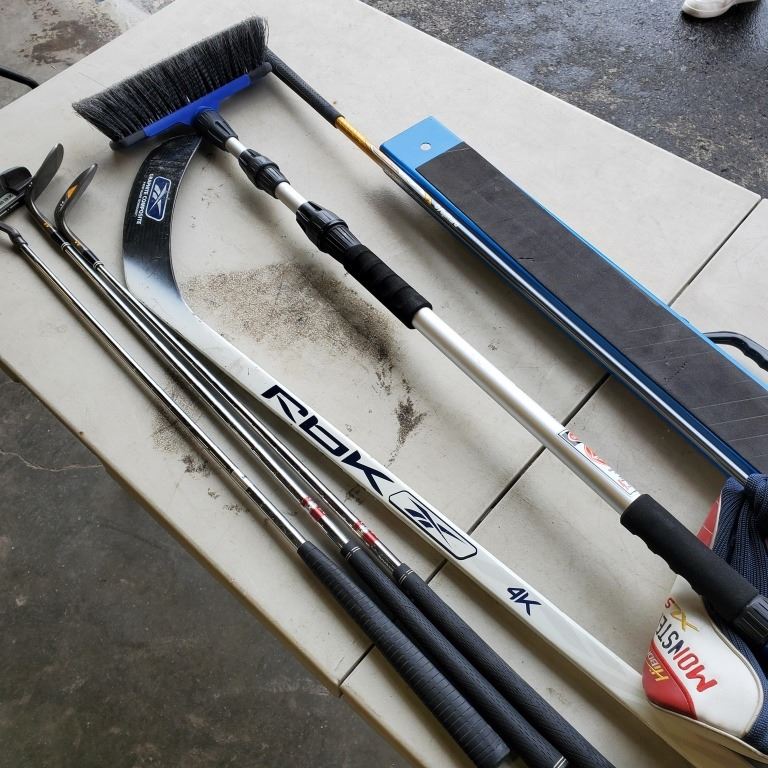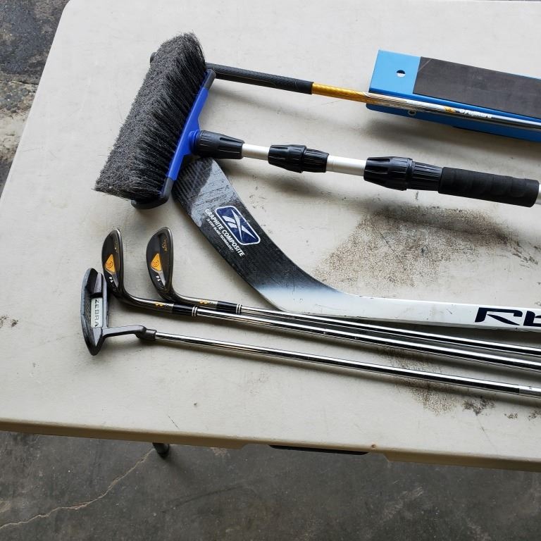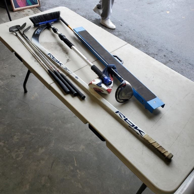 RBK HOCKEY STICK, GOLF CLUBS, BRUSH AND METAL FOLDING SAWHORSE