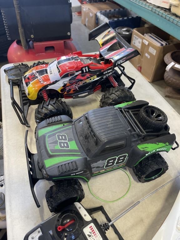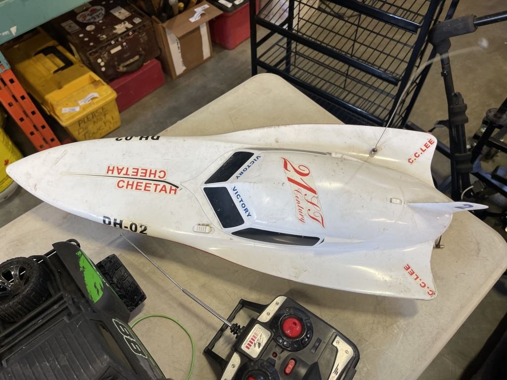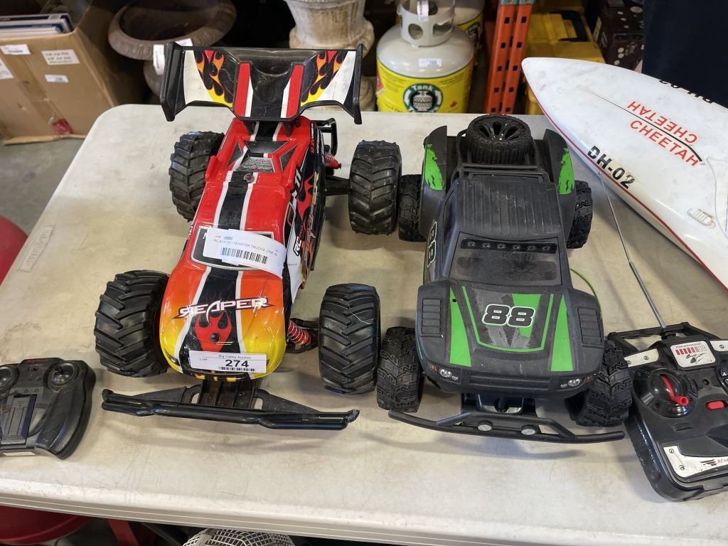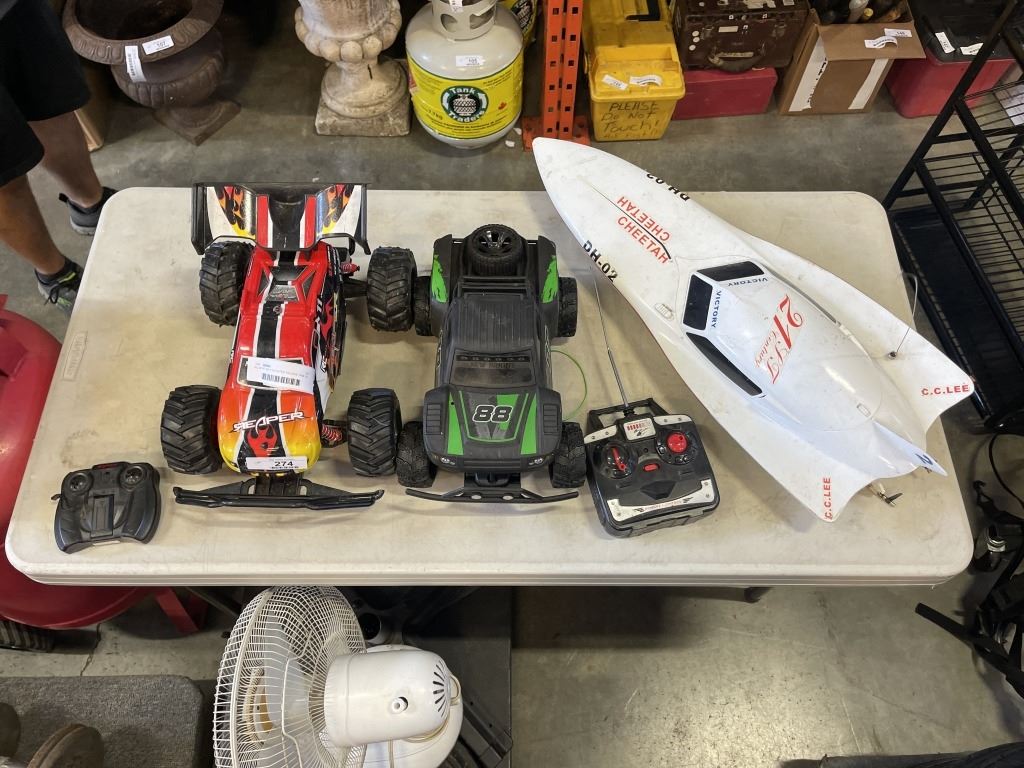 RC BOAT AND 2 MONSTER TRUCKS, ONE IS MISSING REMOTE