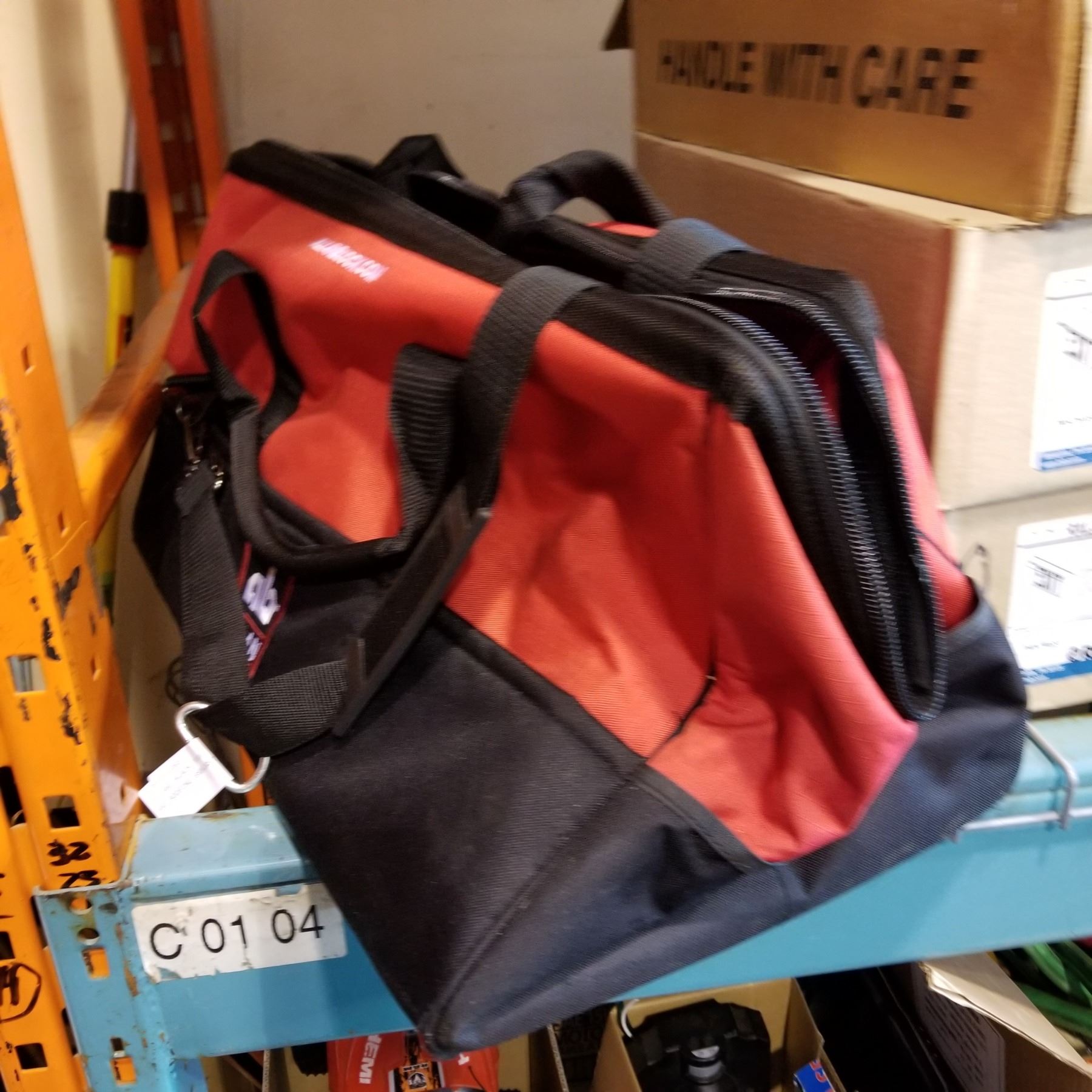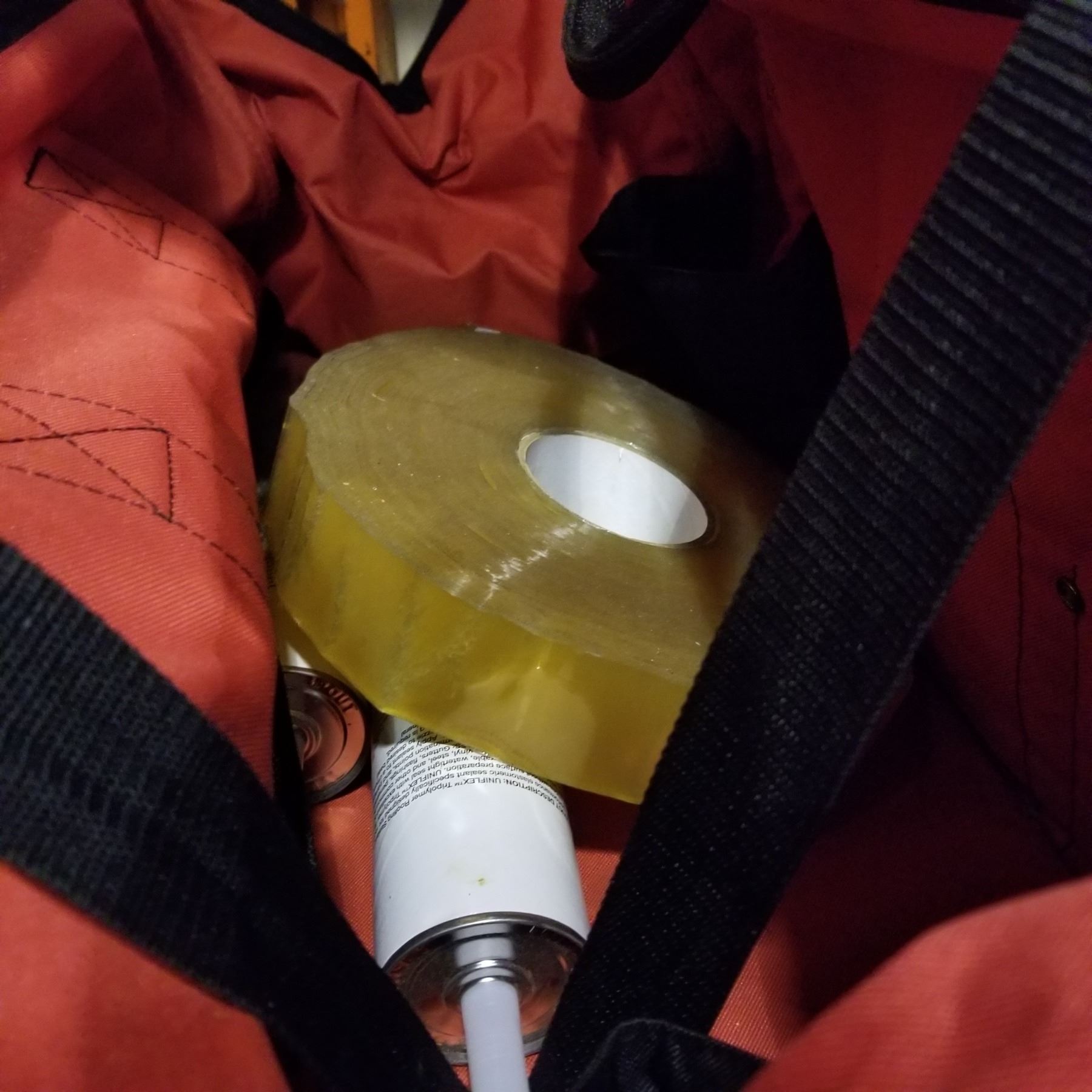 RED AND BLACK TOOL BAG W/ TAPE AND ROOFING SEALANT