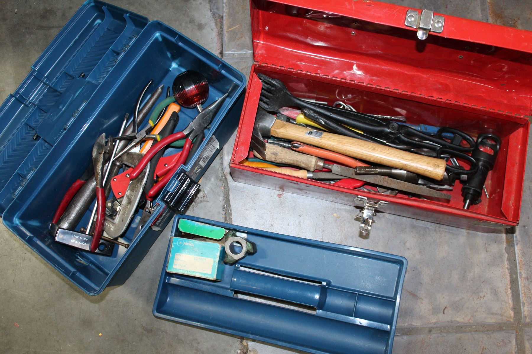 RED AND RUBBERMAID TOOLBOXES WITH TOOLS