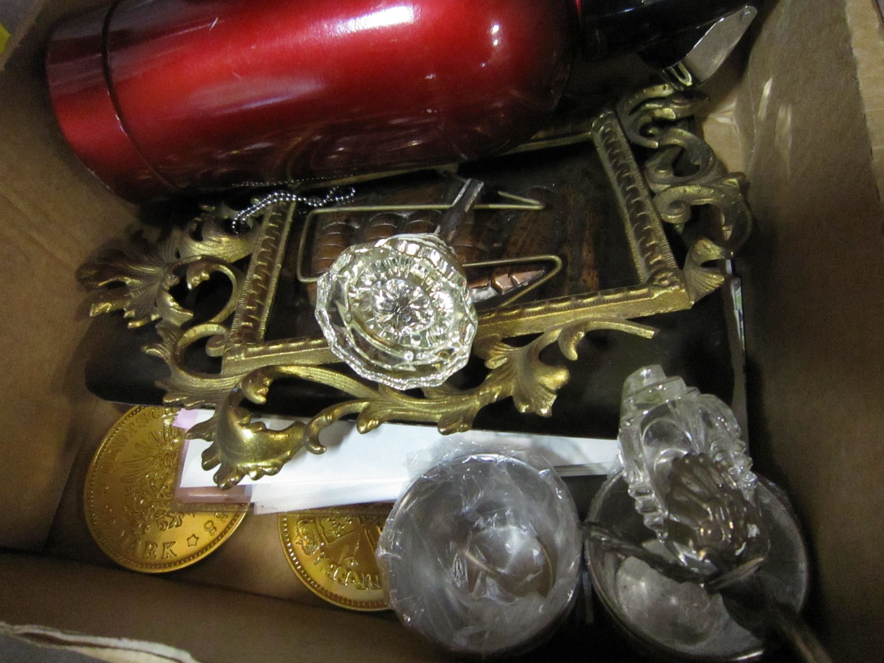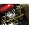 RED ANTIQUE SELTZER BOTTLE MADE IN ENGLAND AND BOX OF COLLECTIBLES