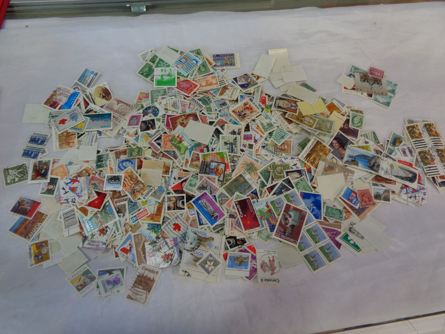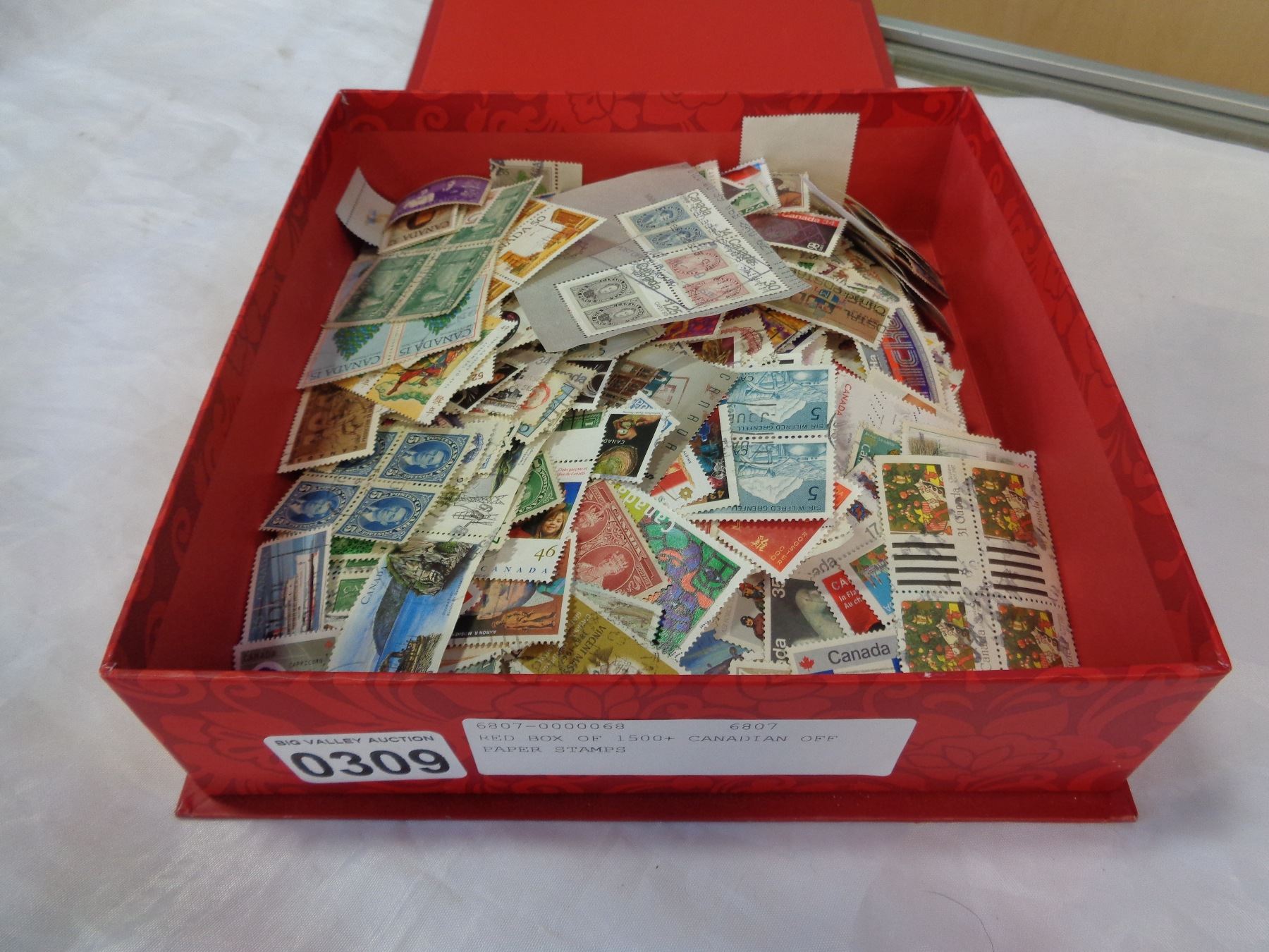 RED BOX OF 1500+ CANADIAN OFF PAPER STAMPS