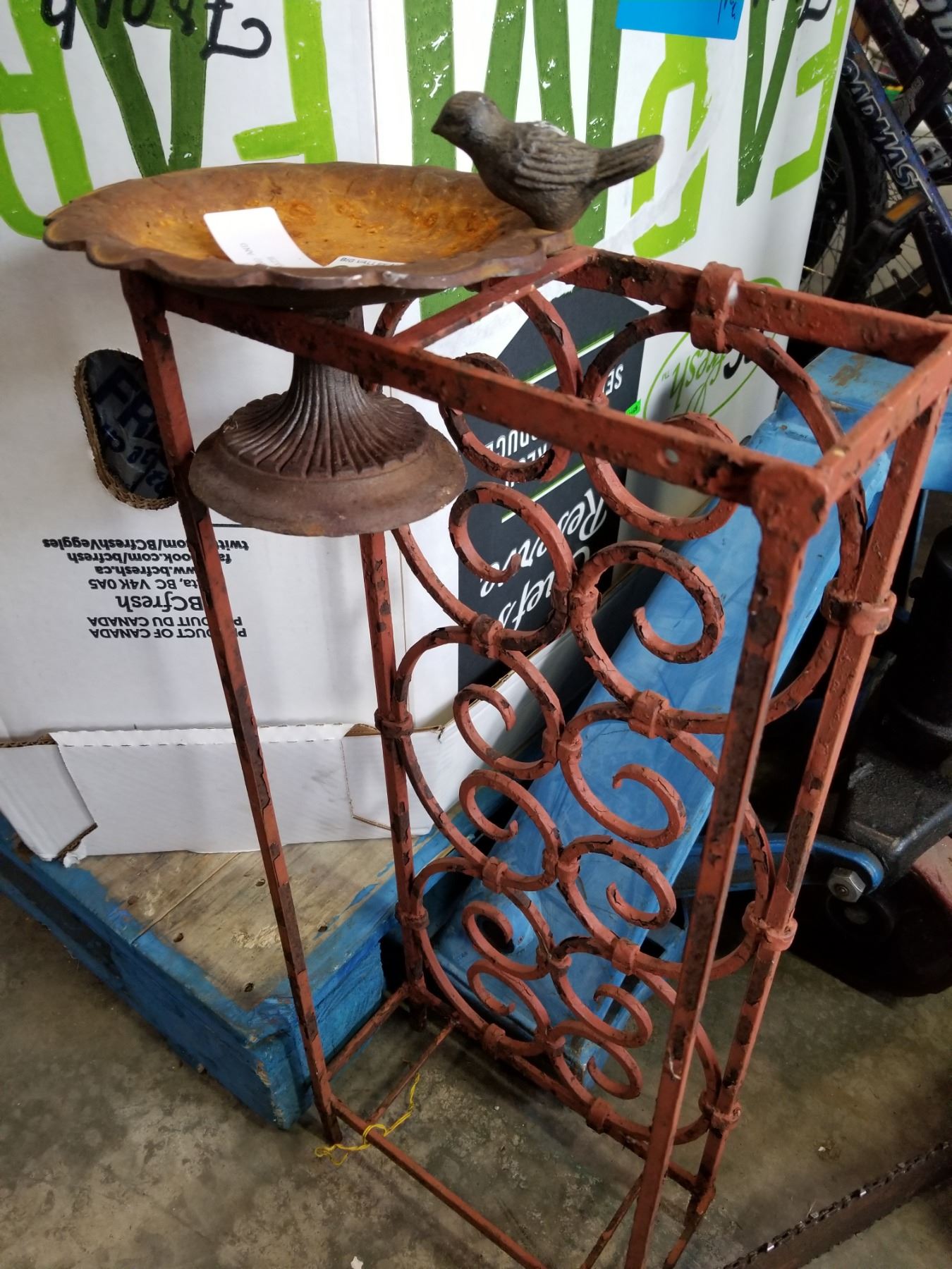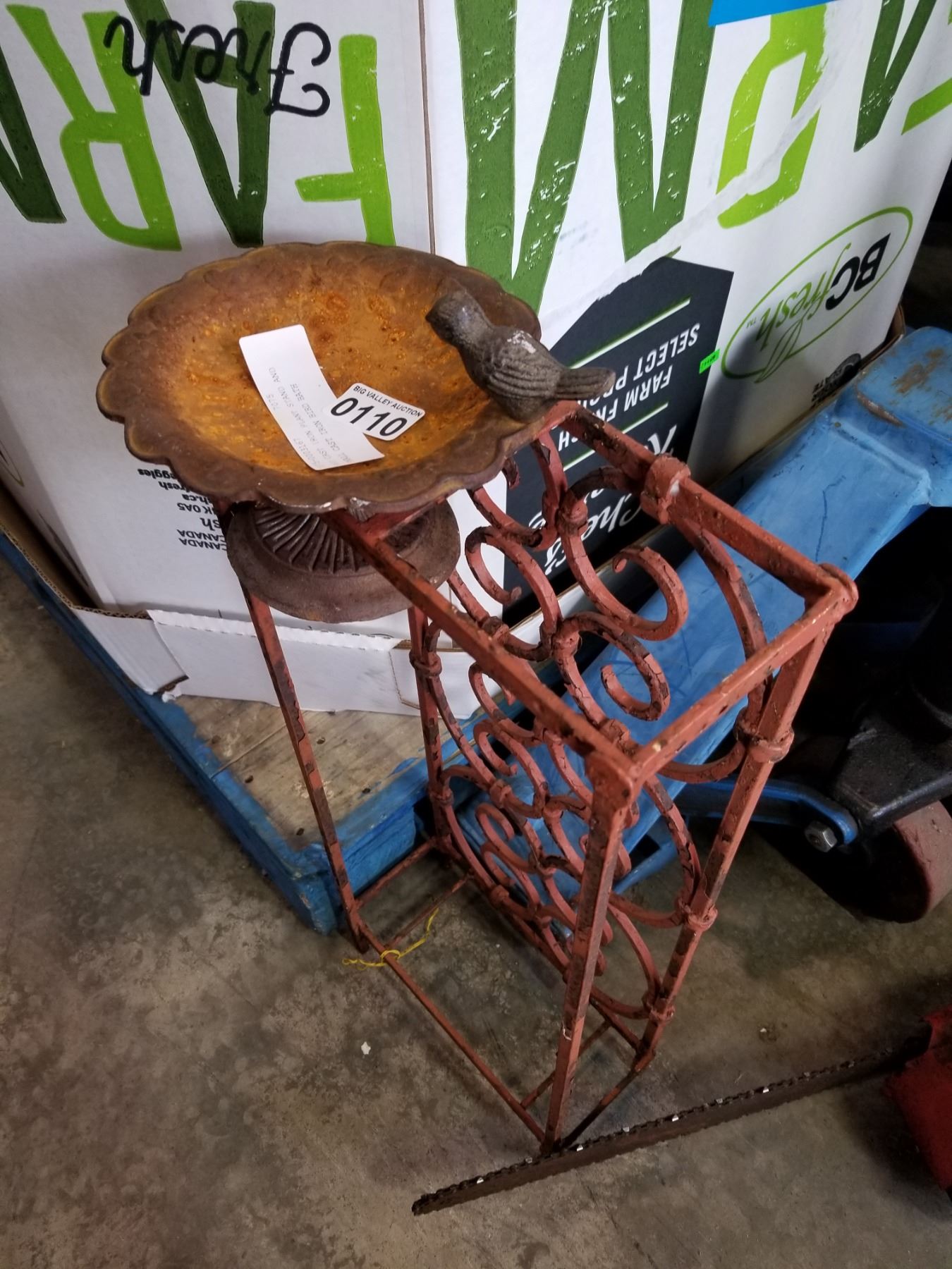 RED CAST IRON PLANT STAND AND SMALL CAST IRON BIRD BATH
