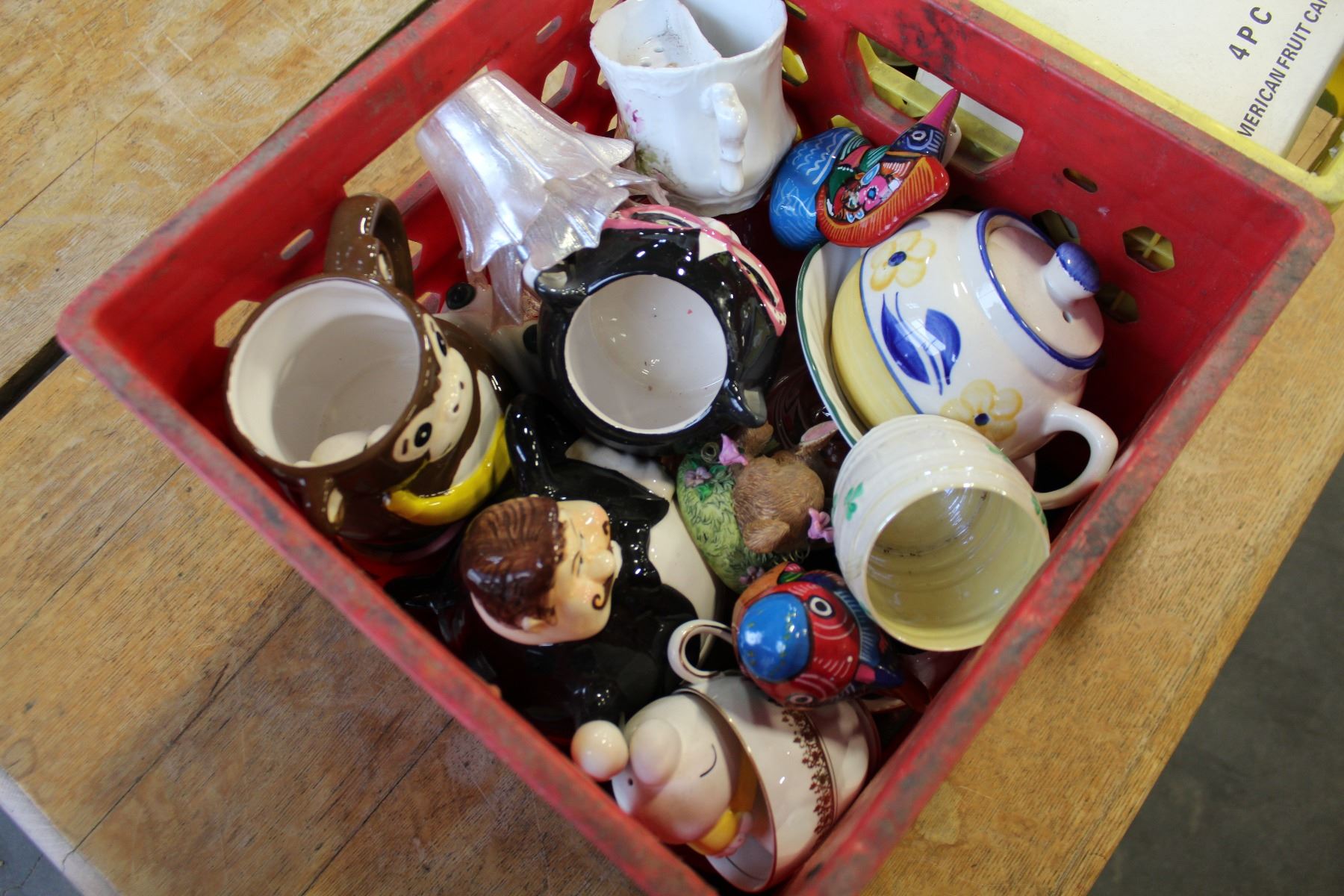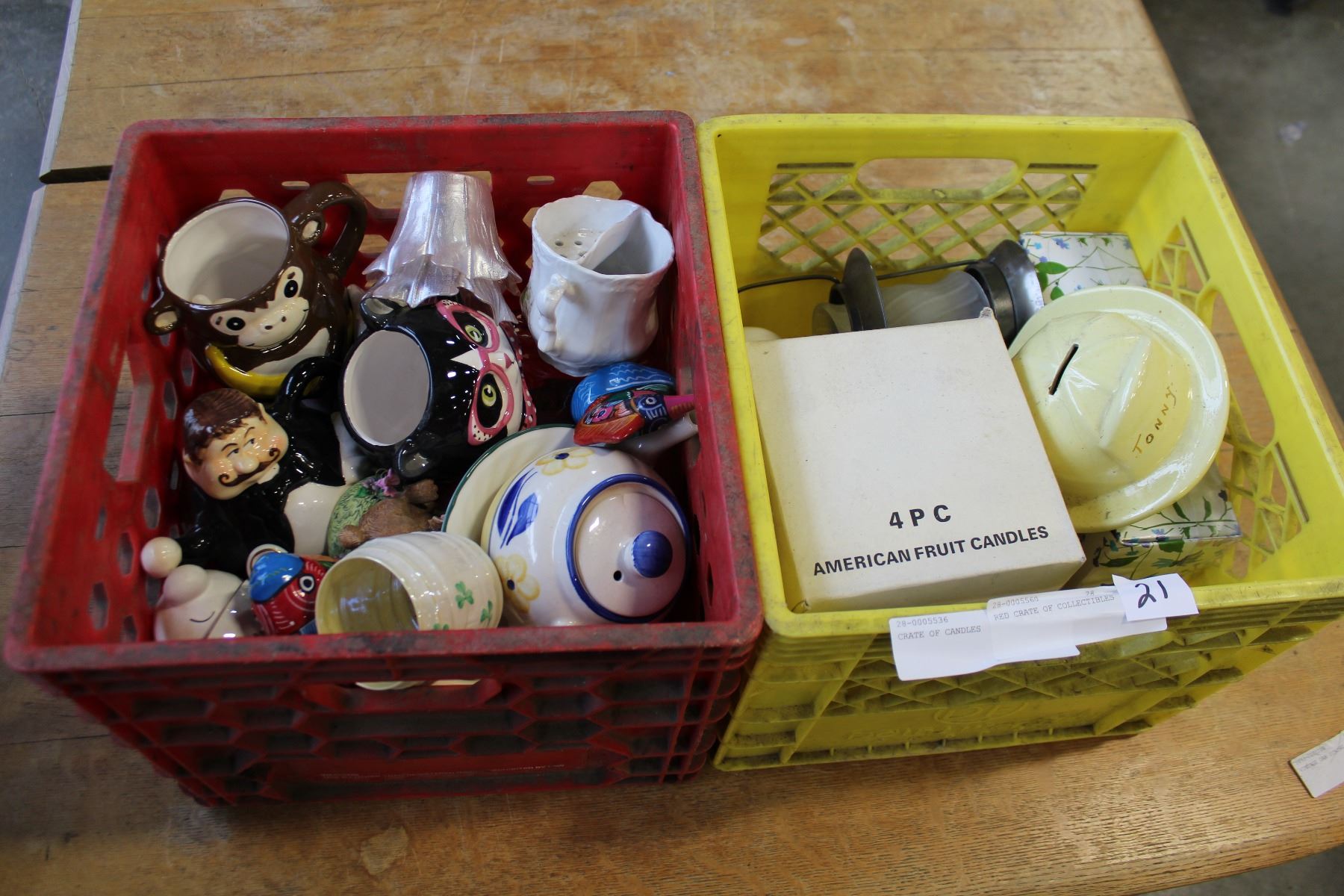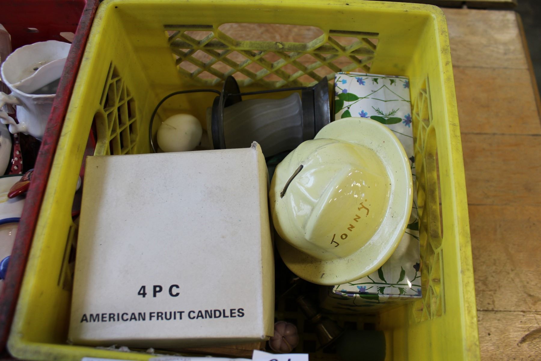 RED CRATE OF COLLECTIBLES AND YELLOW CRATE OF CANDLES